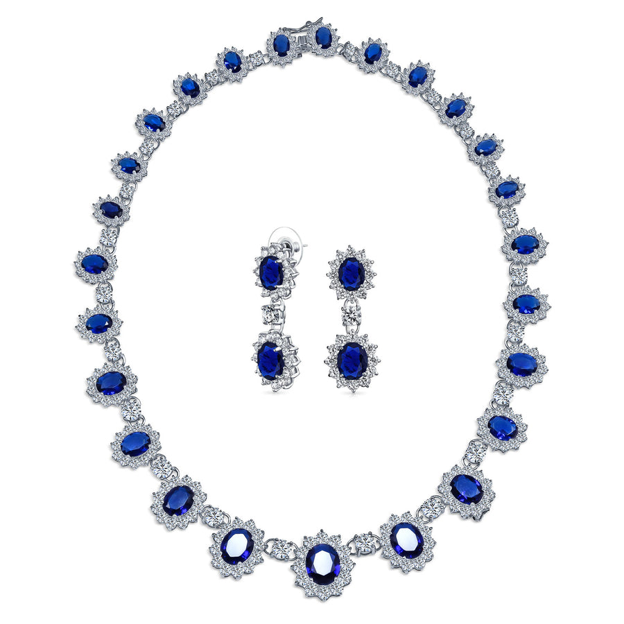 - Shine on your special day with our exquisite wedding necklace set, fit for royalty. Featuring a crown motif, it adds elegance. The oval simulated sapphire CZs sparkle in beautiful blue jewelry. Perfect for weddings or special occasions, our bridal jewelry earrings make you feel like a diva. Crafted with rhodium-plated base metal and simulated sapphire cubic zirconia, it's luxurious and durable. The necklace is 16 inches long and 12mm wide. Earrings measure 1.5 inches long and 0.5 inches wide. Weighing 69 grams, this set is substantial and eye-catching. Complete your look with this stunning 12mm stone piece.