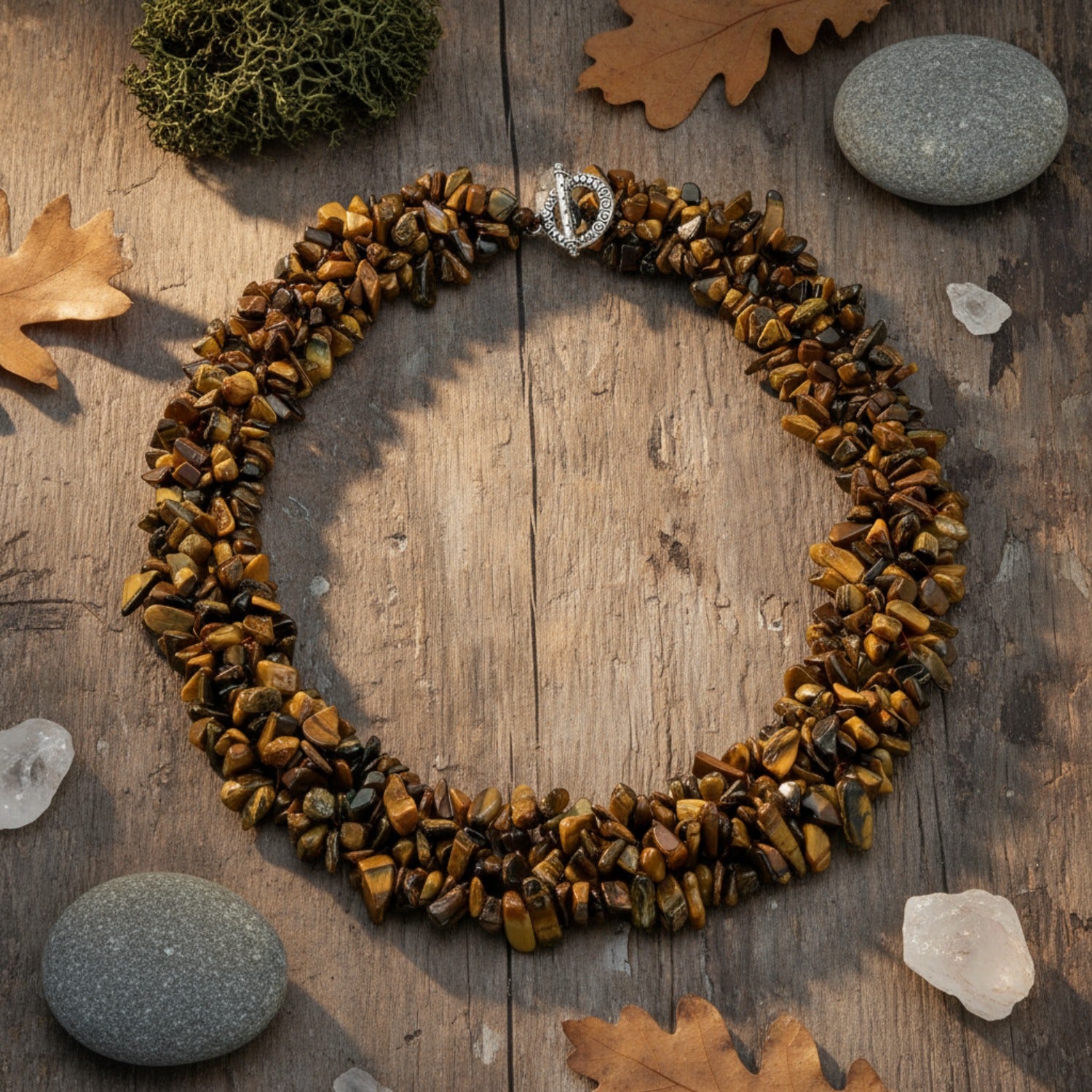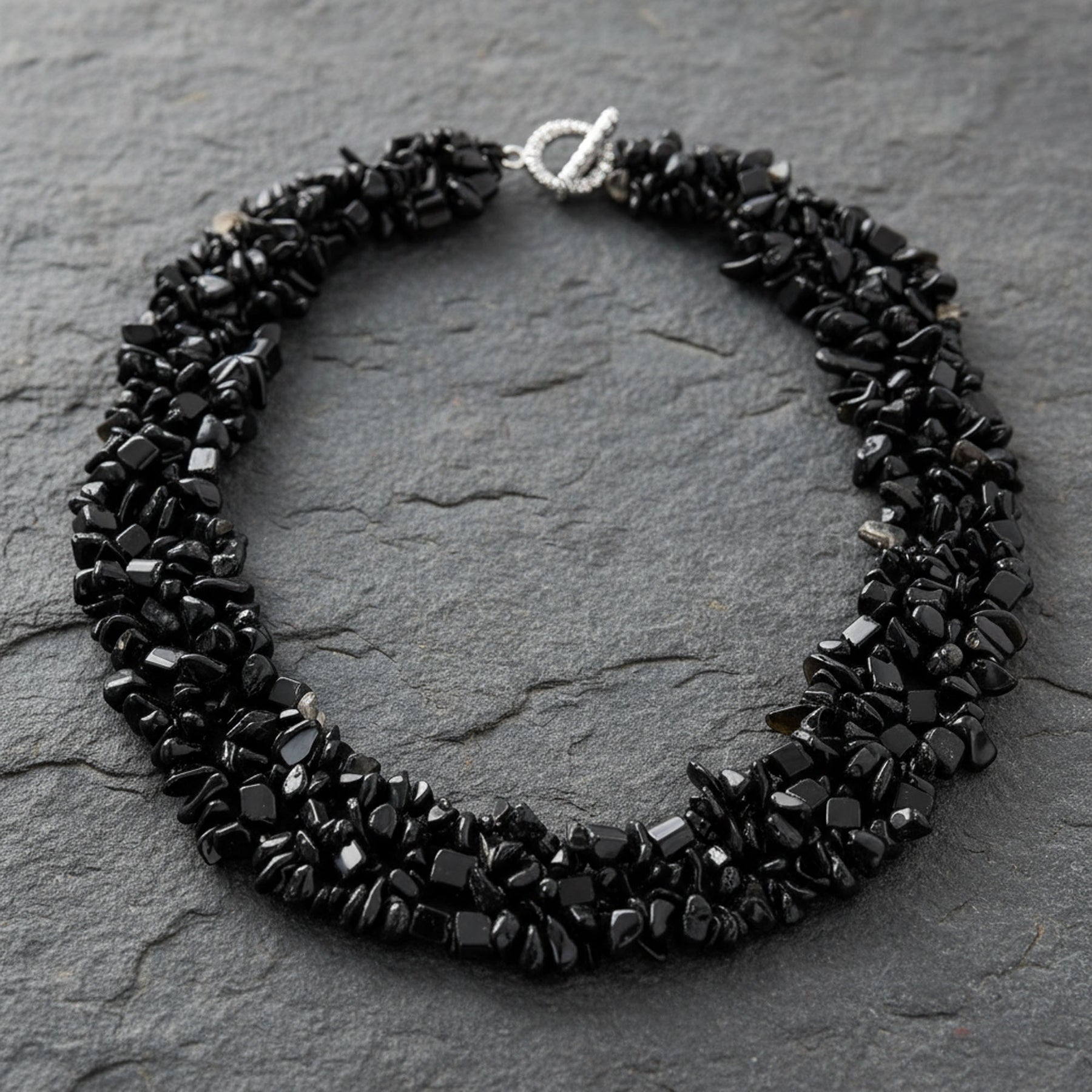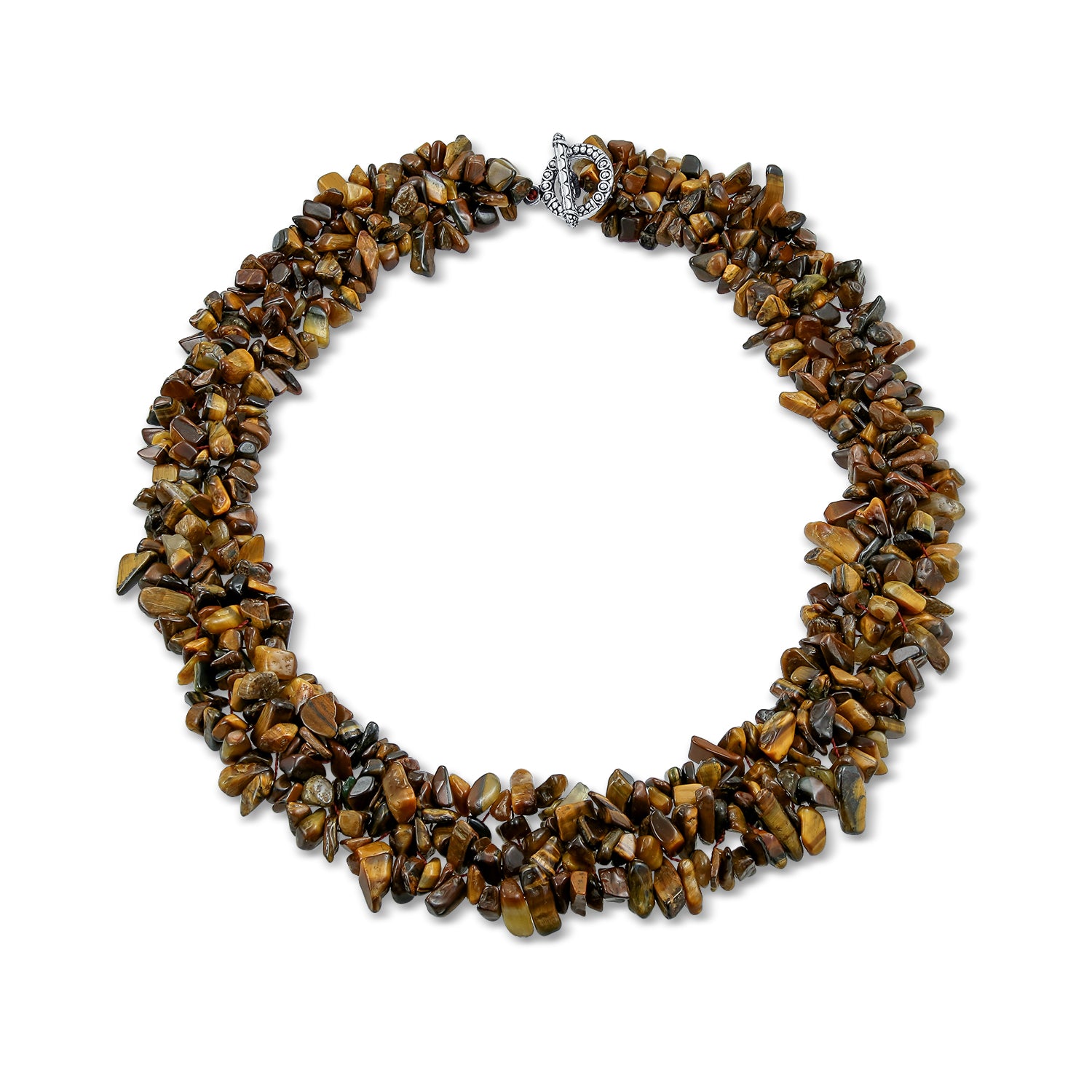 - Undeniably beautiful, this gemstone necklace is the statement jewelry you've been seeking. Rich colors and eye-catching shapes make this bib necklace a treasure. Brilliant chips are strung on an interwoven multi-strand design. This gem jewelry secures with a silver-toned toggle clasp. Chunky gemstone necklaces like this have a bold yet simple style. Perfect pieces that complement any outfit. Dress up your favorite white tee or add pizazz to a summer sundress. With these Statement Necklaces, you'll always be in style.