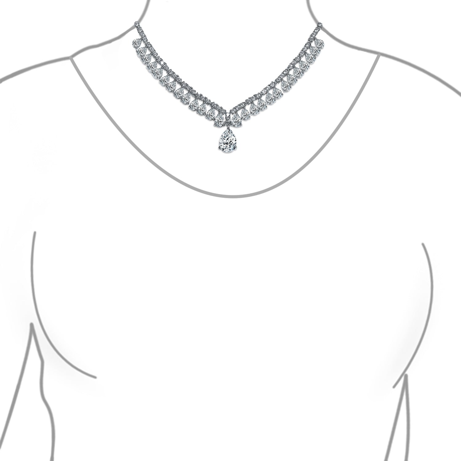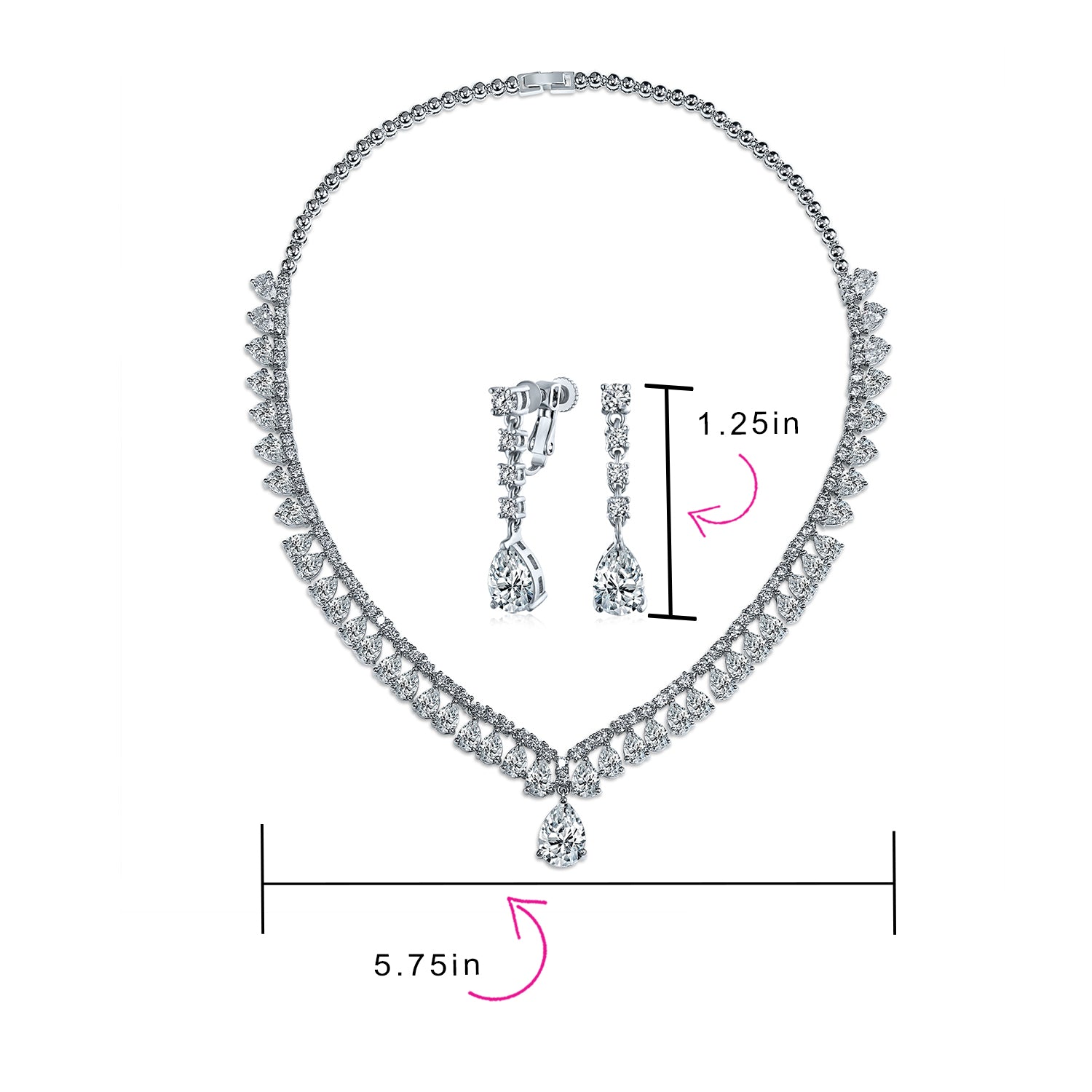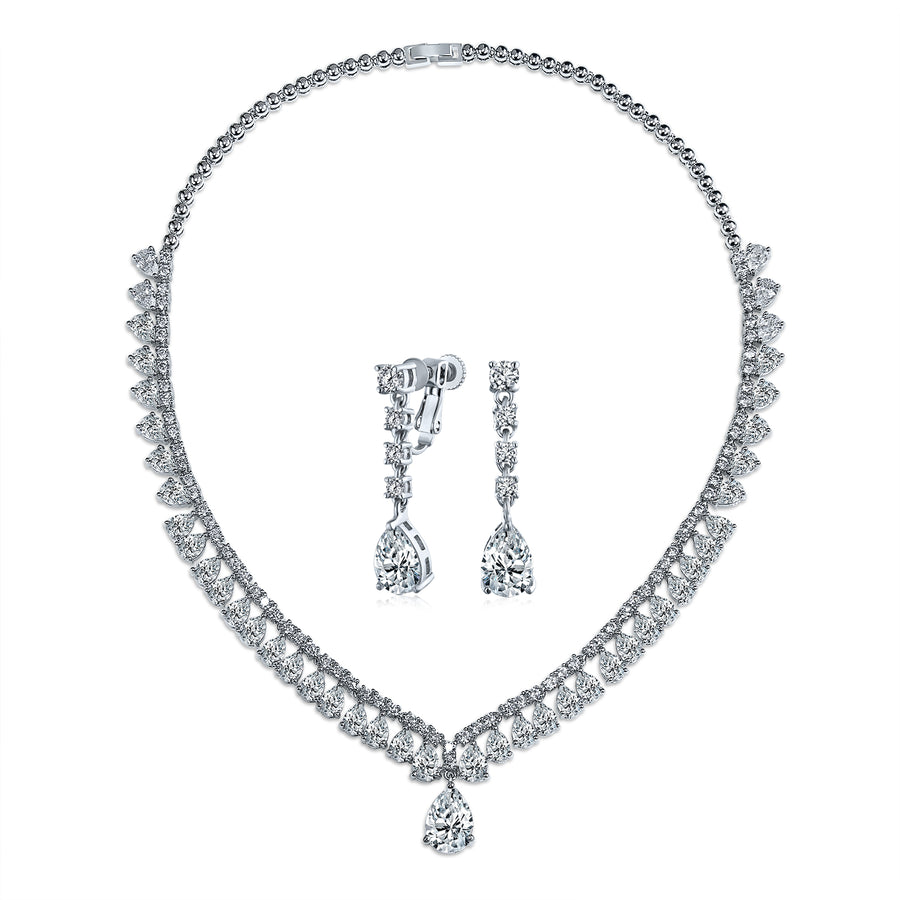 - BRIDAL JEWELRY SET - Includes clip-on earrings and a necklace adorned with over 50 dazzling cubic zirconias in round and pear shapes, beautifully arranged in a starburst pattern. The necklace offers a substantial weight and is fastened with an interlocking latch clasp and wing closure for a secure and sophisticated fit.