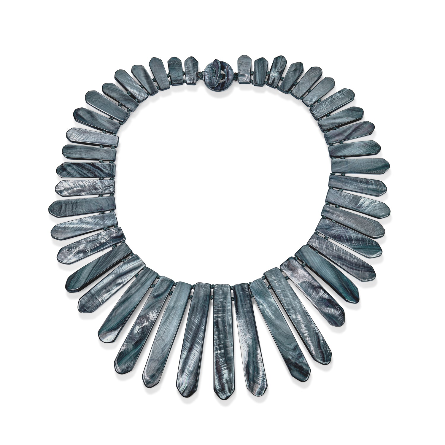 - Our flat spike shell contoured necklace with toggle closure looks great with a plain t-shirt and jeans or with your favorite black dress.