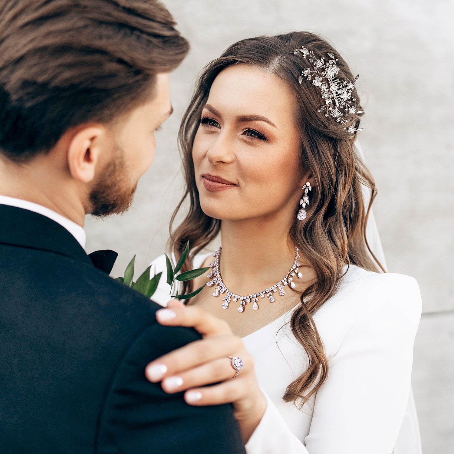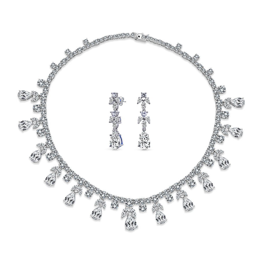 - Introducing our exquisite CZ teardrop wedding necklace set, perfect for elevating your style and feeling like a true fashionista. This stunning piece is an ideal gift for someone special or a treat for yourself. Crafted with precision, it features marquise cubic zirconia stones that add sparkle and elegance to any outfit. Perfect for brides or special occasions, this jewelry will make you shine bright. Also, an excellent choice for bridesmaids' gifts, imagine matching marquise cubic zirconia jewelry on the wedding day. Celebrate April birthdays with our beautiful April birthstone jewelry collection. Invest in timeless beauty and create unforgettable memories.