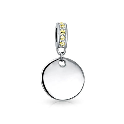 - This modest polished Circle Disc shaped charm hangs from a 4.5mm unthreaded core and holds a single, elegant yellow simulated citrine November birth month color, perfect for bringing that unique something to your bead story.