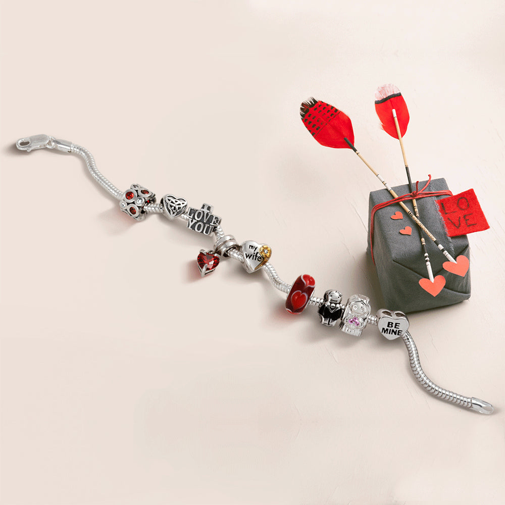 - This Murano Red Heart glass bead, made from .925 sterling silver, features red and white hearts. Perfect for charm bracelets or necklaces. Pair with crystal, glass, birthstone, or enamel beads from our collection. Add a unique story to your jewelry.