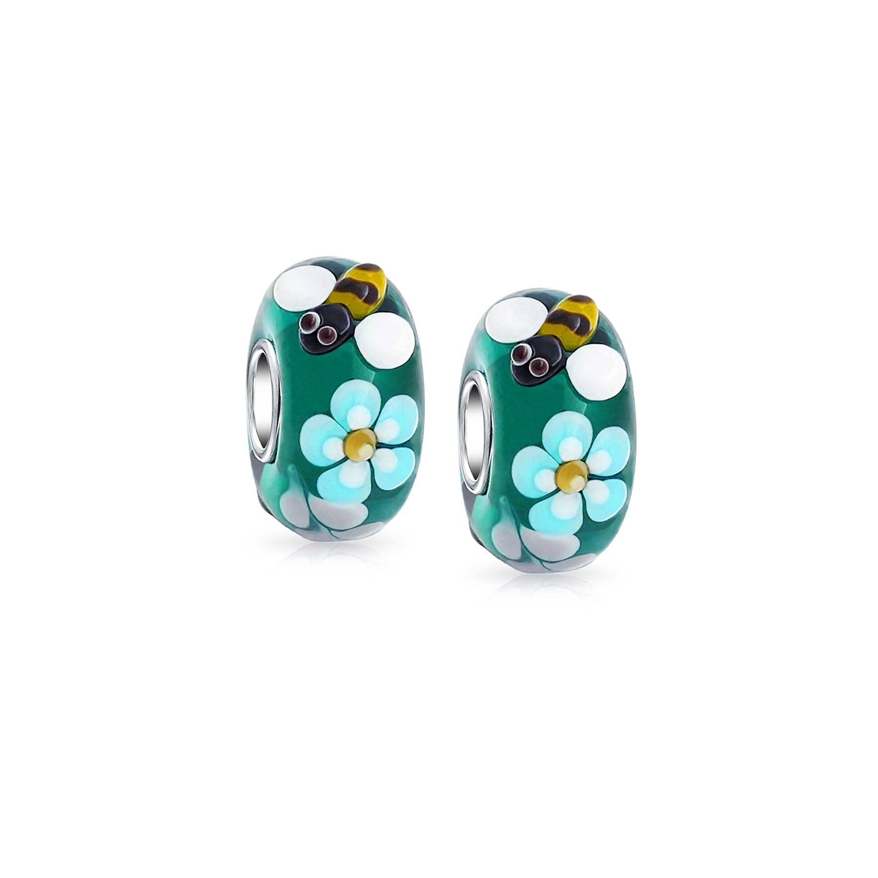 - Be the talk of the town with this Murano glass bumblebee bead bracelet. This adorable teal glass bead features a lamp work design with bumblebees and blue flowers. Pair this sterling silver flower bead with your other floral jewelry. Add this Murano glass animal bead to your bracelet before it flies away.