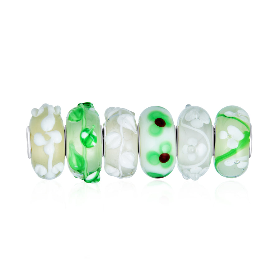 - Set of Six Assorted White and Green Flower Lampwork Beads add a feminine romantic touch to your bead story.