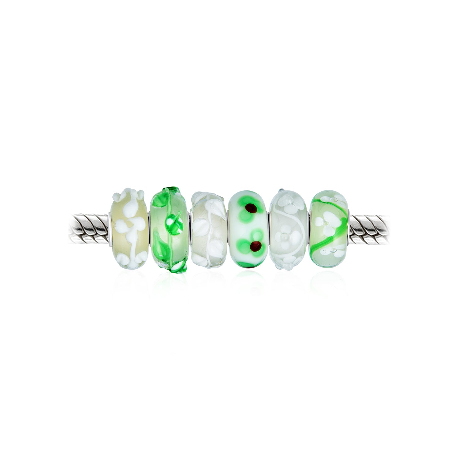 - This White Murano Glass Bead Bundle includes six artistically-crafted, round beads. Each bead is .5 inches in diameter with a 4mm .925 sterling silver core. These stylish beads are mostly white with lime green splashes. Perfect for personalized European Story bracelets. Ideal for gifts or adding to your unique charm bracelet. Available in various patterns like love, crystal, heart, and animal beads. Fits bracelets, necklaces, earrings, and keychains. Enhance your Italian charm bead collection with these stunning Murano glass beads.