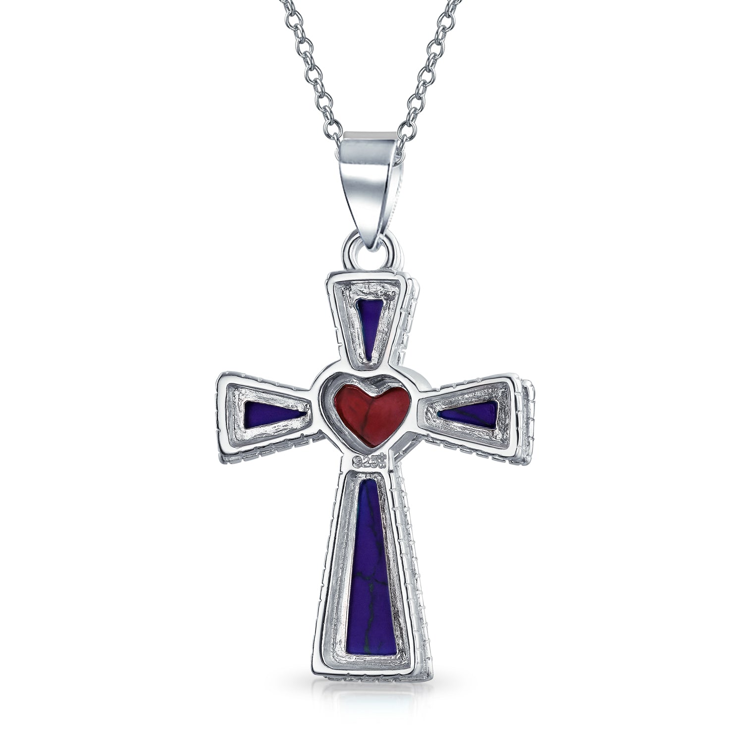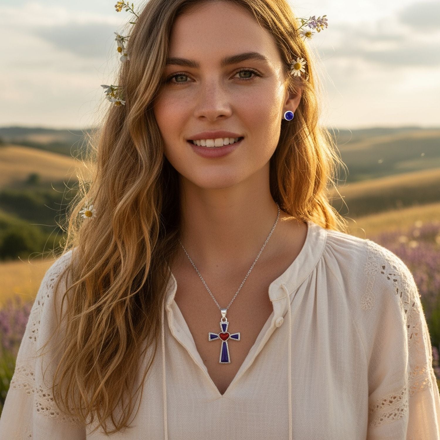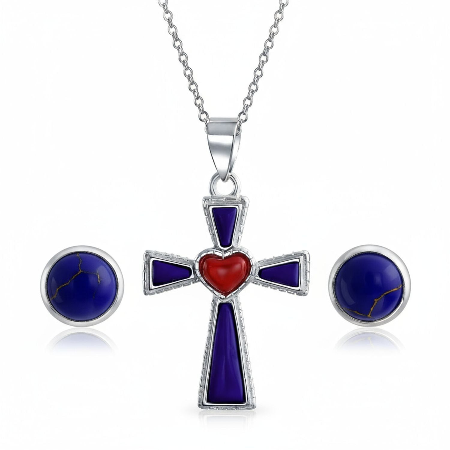 • This sterling silver set features a striking cross pendant necklace with blue Lapis Lazuli stones and a red turquoise heart center on an 18-inch chain, paired with matching round Lapis Lazuli stud earrings showcasing the December birthstone. Perfect for expressing faith, celebrating birthdays, or adding a meaningful pop of color to any outfit, this set makes a thoughtful gift for women of all ages.