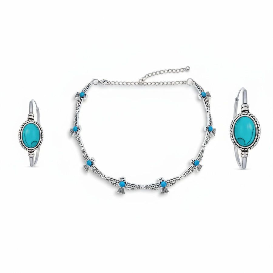 South Western Boho Turquoise Gemstone Eagle Choker & Hoop Earrings Jewelry Set