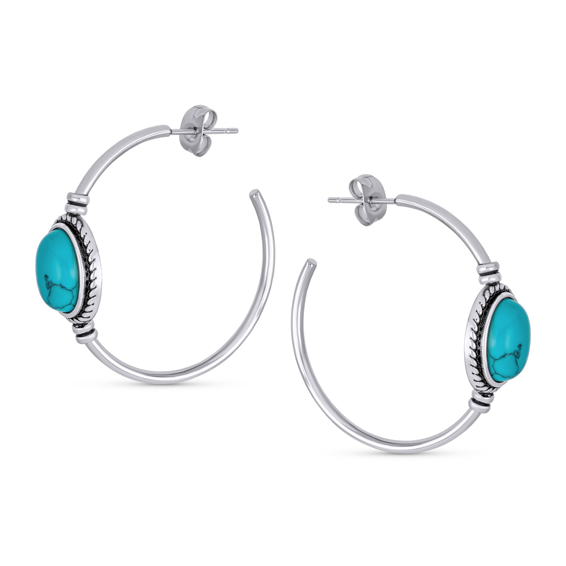 • Elevate your style with this Southwestern-inspired jewelry set, featuring an oxidized choker necklace with a simulated turquoise center and matching compressed turquoise hoop earrings framed in a twisted rope design. Crafted from rhodium-plated alloy and stainless steel, this set brings timeless Southwestern charm and vibrant color to any outfit, perfect for boho chic looks or adding a touch of desert-inspired elegance.