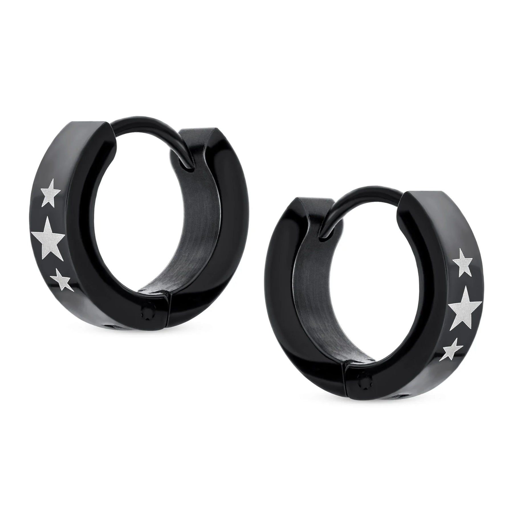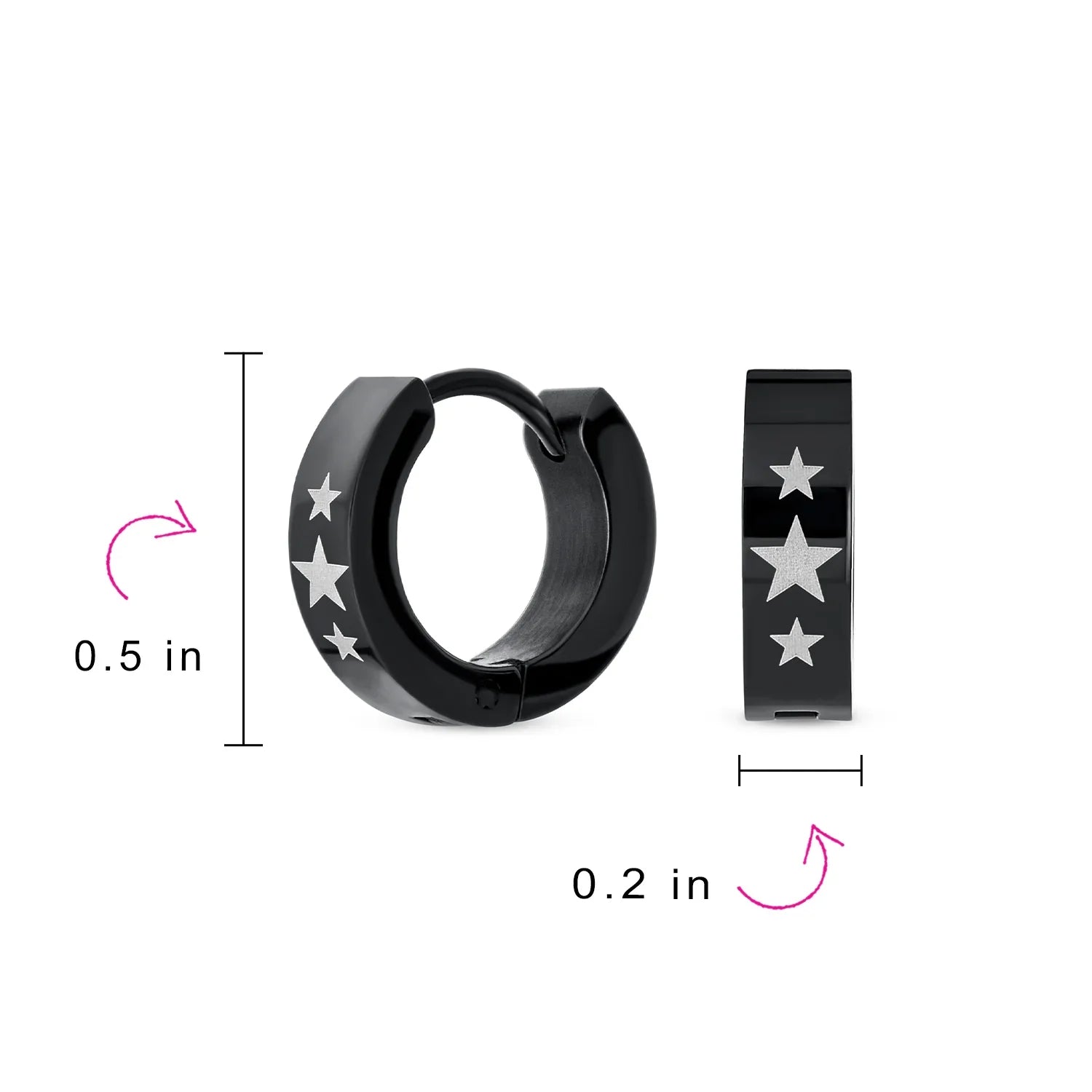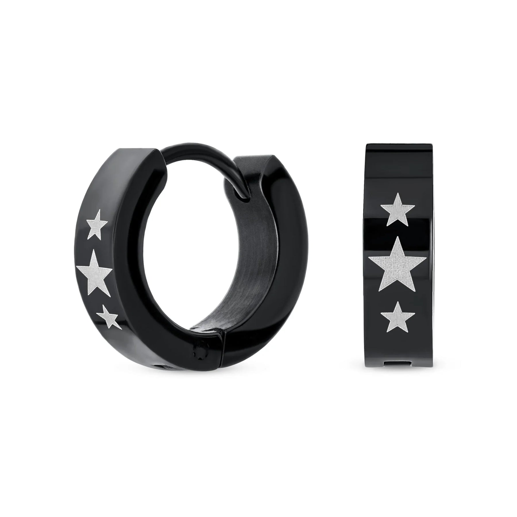 • Hell love our 0.5in, black IP plated steel huggie hoops to enhance any ensemble. With a laser etched super star earrings are a great gift.