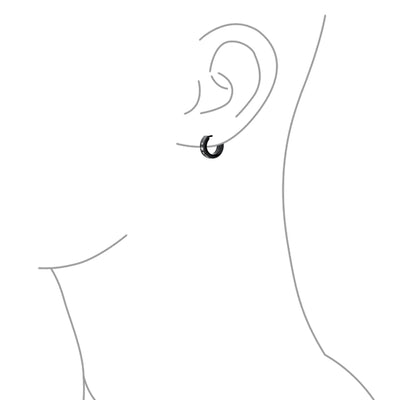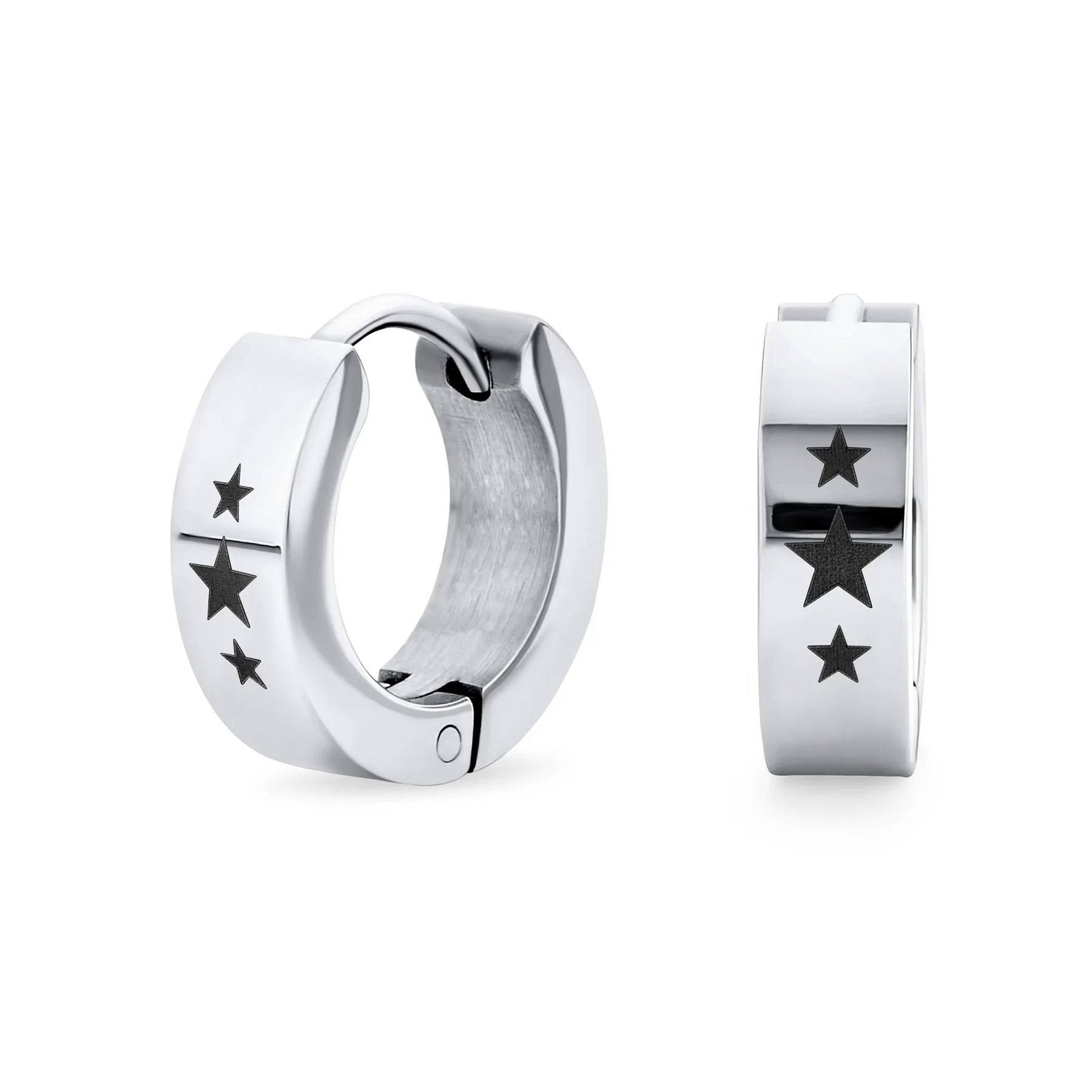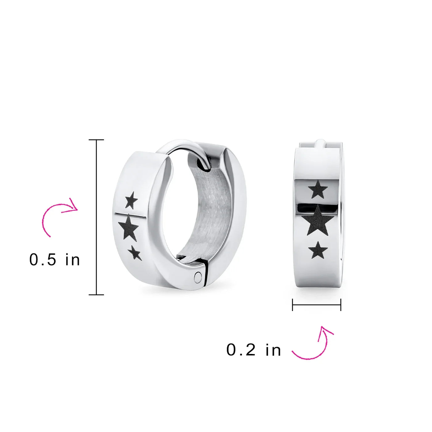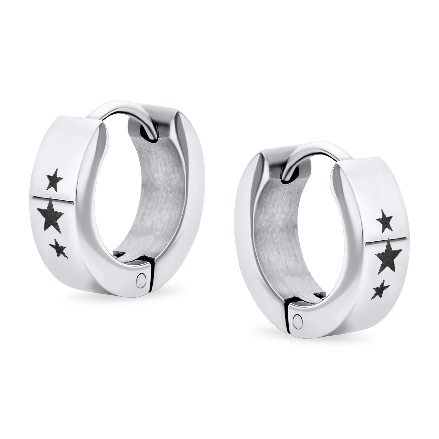 • Hell love our 0.5in, black IP plated steel huggie hoops to enhance any ensemble. With a laser etched super star earrings are a great gift.
