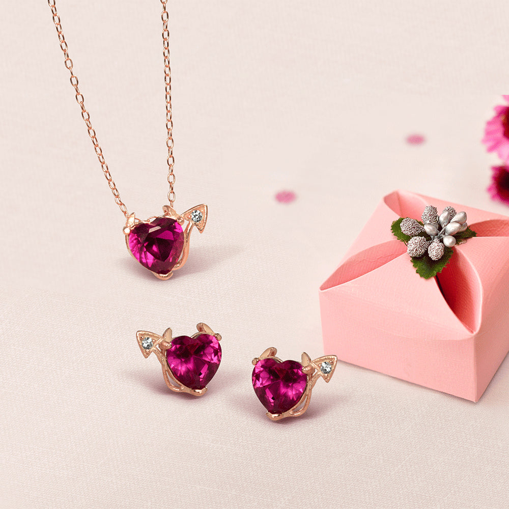 - Searching for a unique and charming Valentine’s gift? This Rose Gold Plated Simulated Ruby CZ devil necklace is perfect. Ideal for mischievous souls seeking a fun, unpredictable present. Adorable July birthstone necklace for your sweetheart or Valentine’s Day. Features a heart-shaped Simulated Ruby framed with Gold Plated devil horns and a pitchfork. A sweet and saucy heart-shaped necklace for your Valentine. Includes an 18-inch Rose Gold Plated chain.