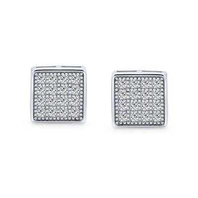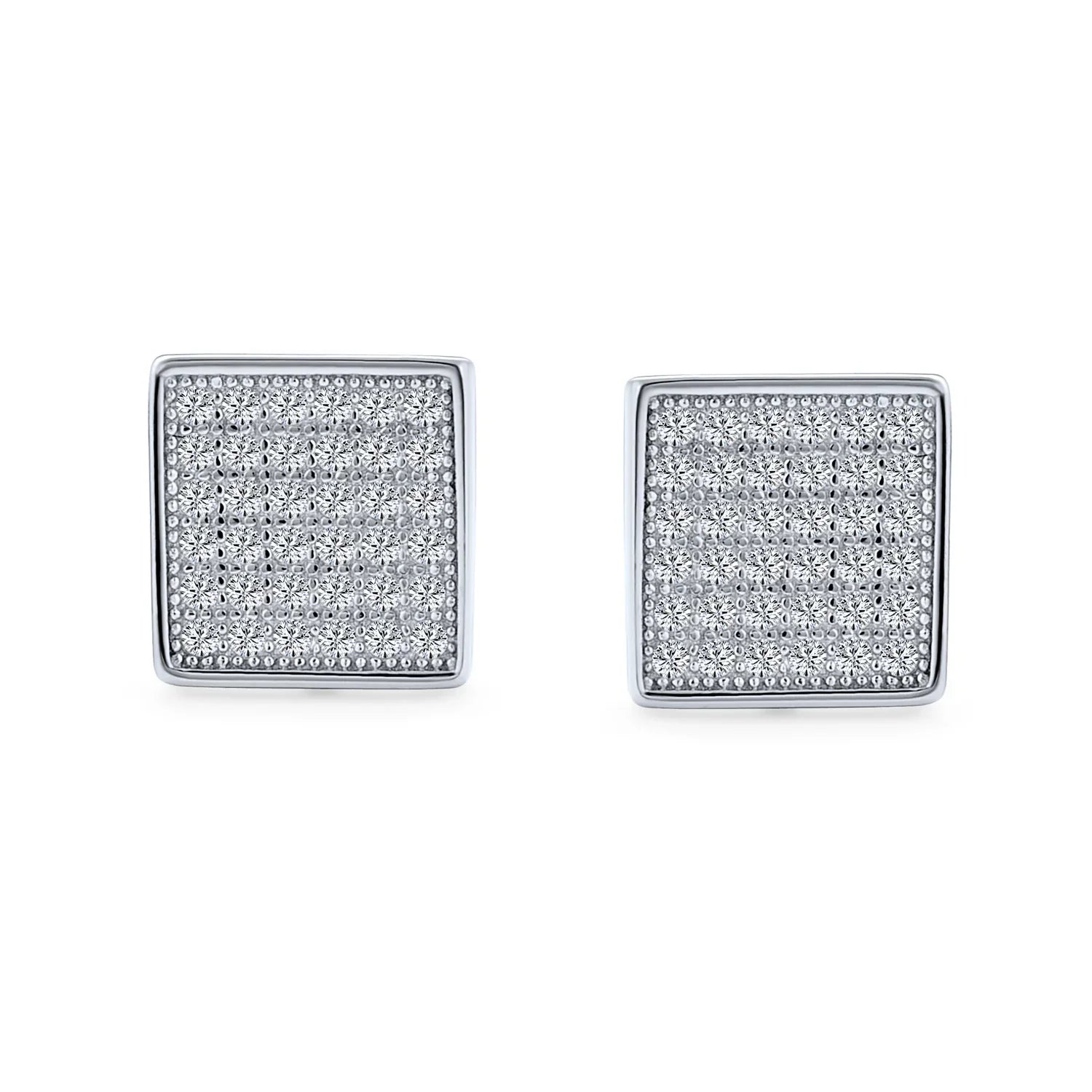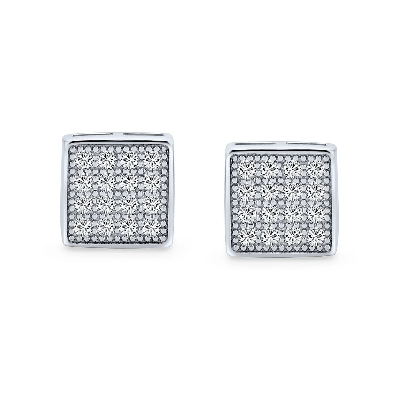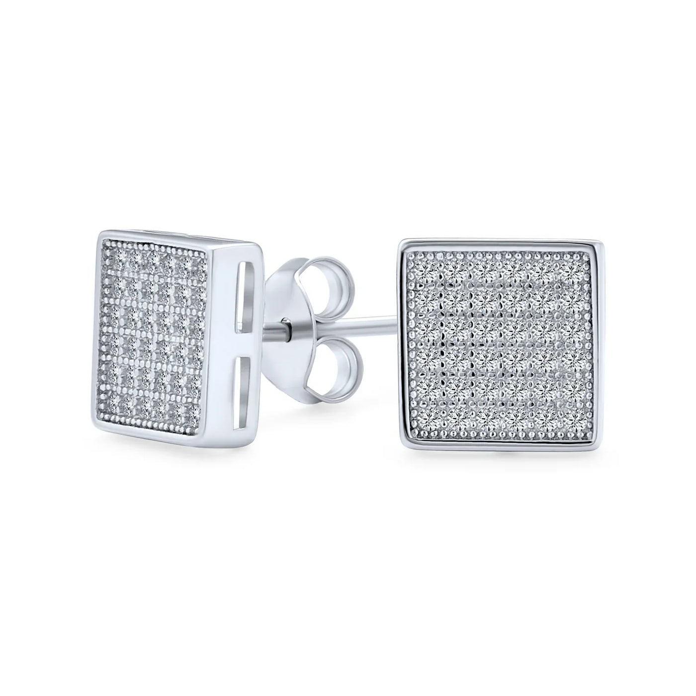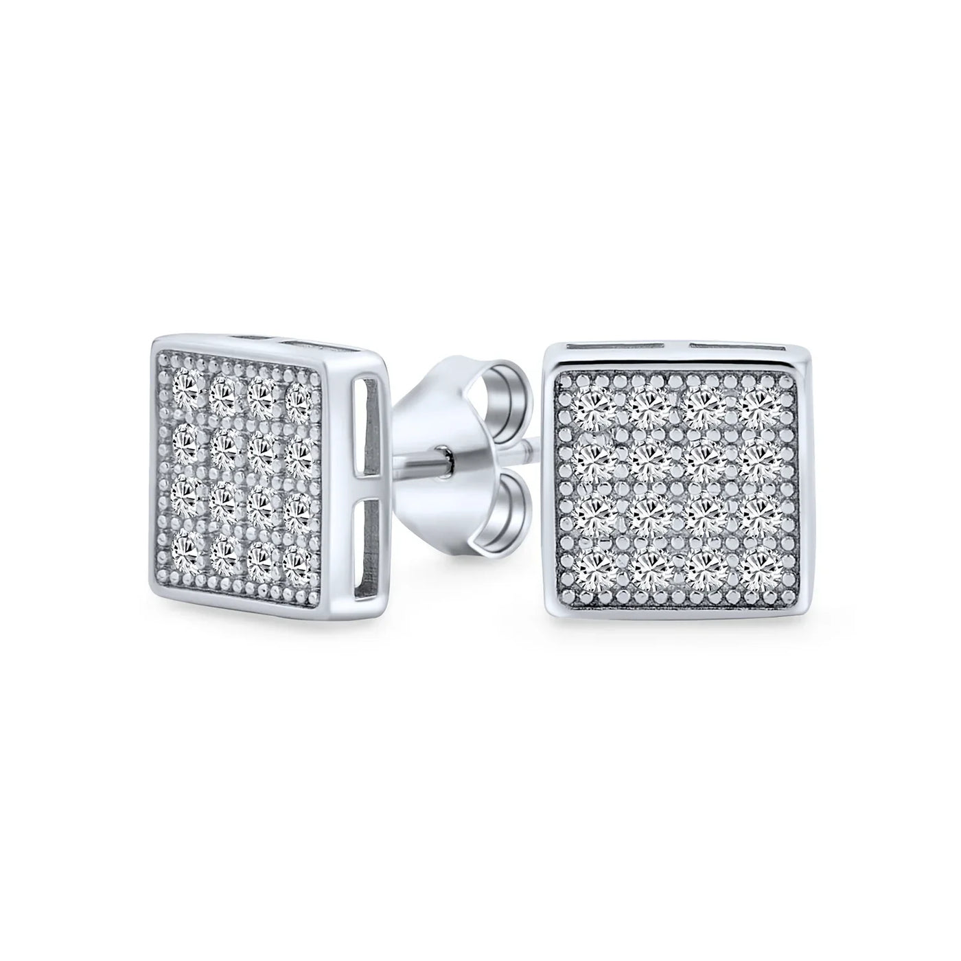 - Dress these up or down. These mens cz stud earrings are made of .925 sterling silver and cubic Zirconias and coated in Gold Plated. A pave design emits tons of shine in a pair of stud earrings that will definitely stand out. A simple pair of clear cz earrings makes a great gift for anyone. These square stud earrings include a friction back so that you will not have any chance of losing them. Designed for pierced ears only.