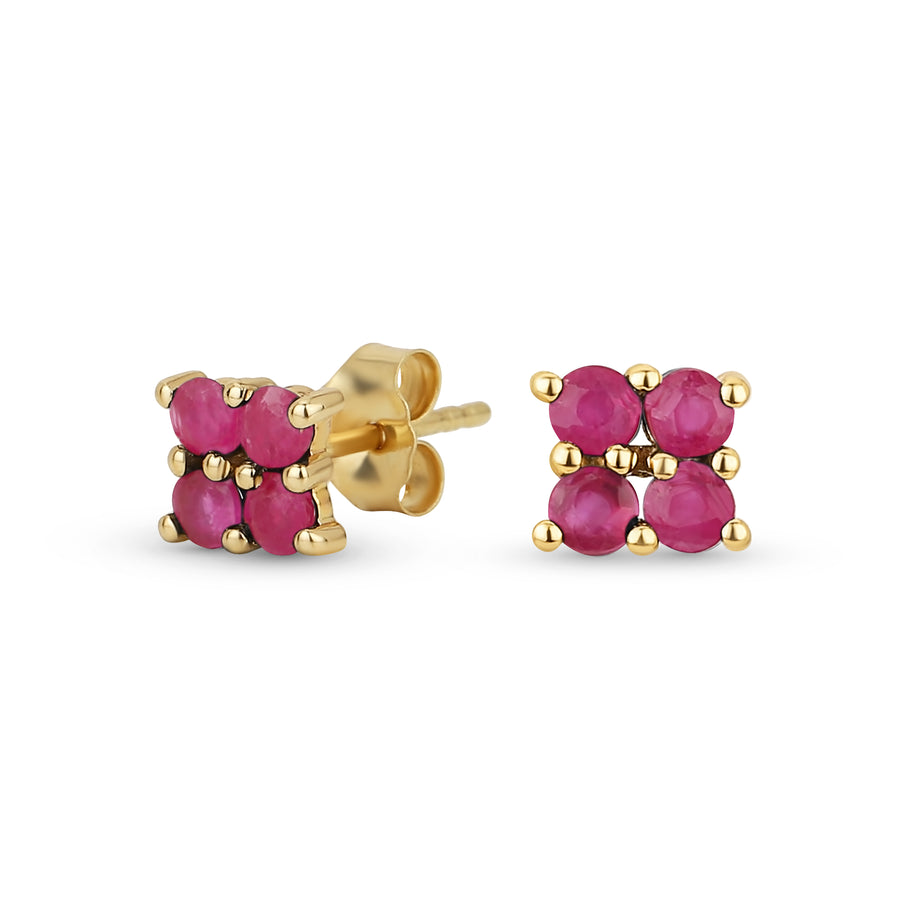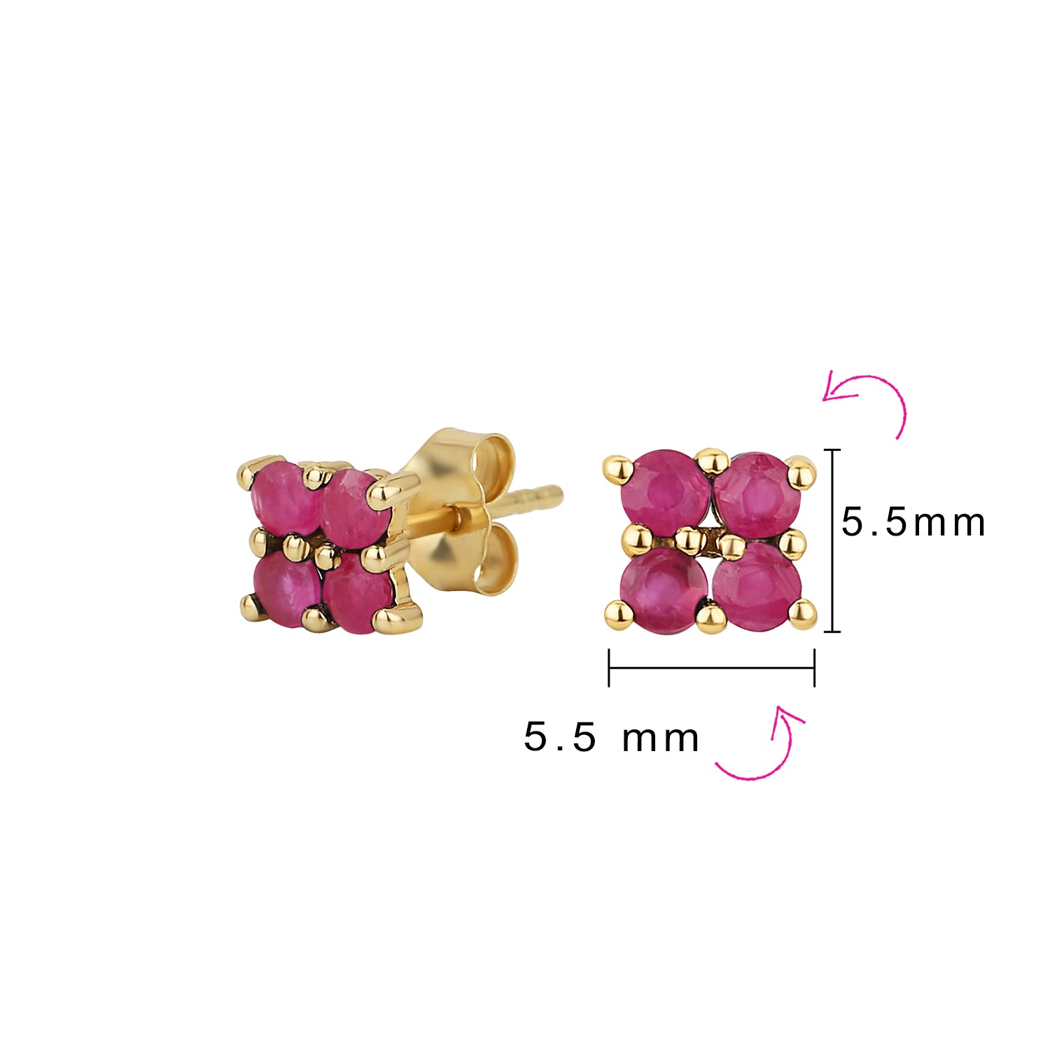 • These petite stud earrings showcase square stud earrings adorned with four Ruby gemstones. Rubies are considered a symbol of deep emotions and are commonly used in engagement rings and other romantic jewelry pieces. Ruby is also the birthstone for the month of July.