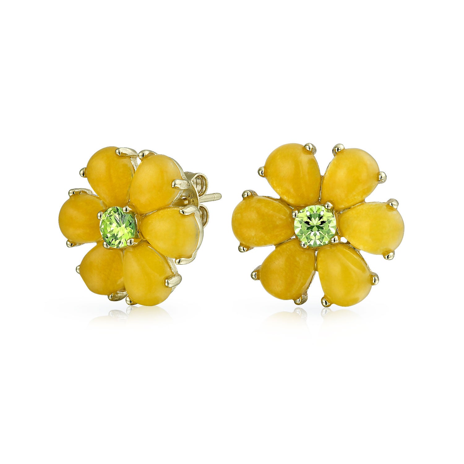 - Celebrate a November birthday with stunning birth month earrings. Crafted with precision, they feature six vibrant teardrop petals. Each flower has a sparkling CZ simulated Peridot center. These unique gold clip-on earrings add sophistication to any outfit. Perfect for any woman on your gift list. The yellow hue adds a pop of color to neutral ensembles. Versatile and elegant, they enhance any jewelry collection. Treat yourself or surprise a friend who loves semi-precious gemstone jewelry.