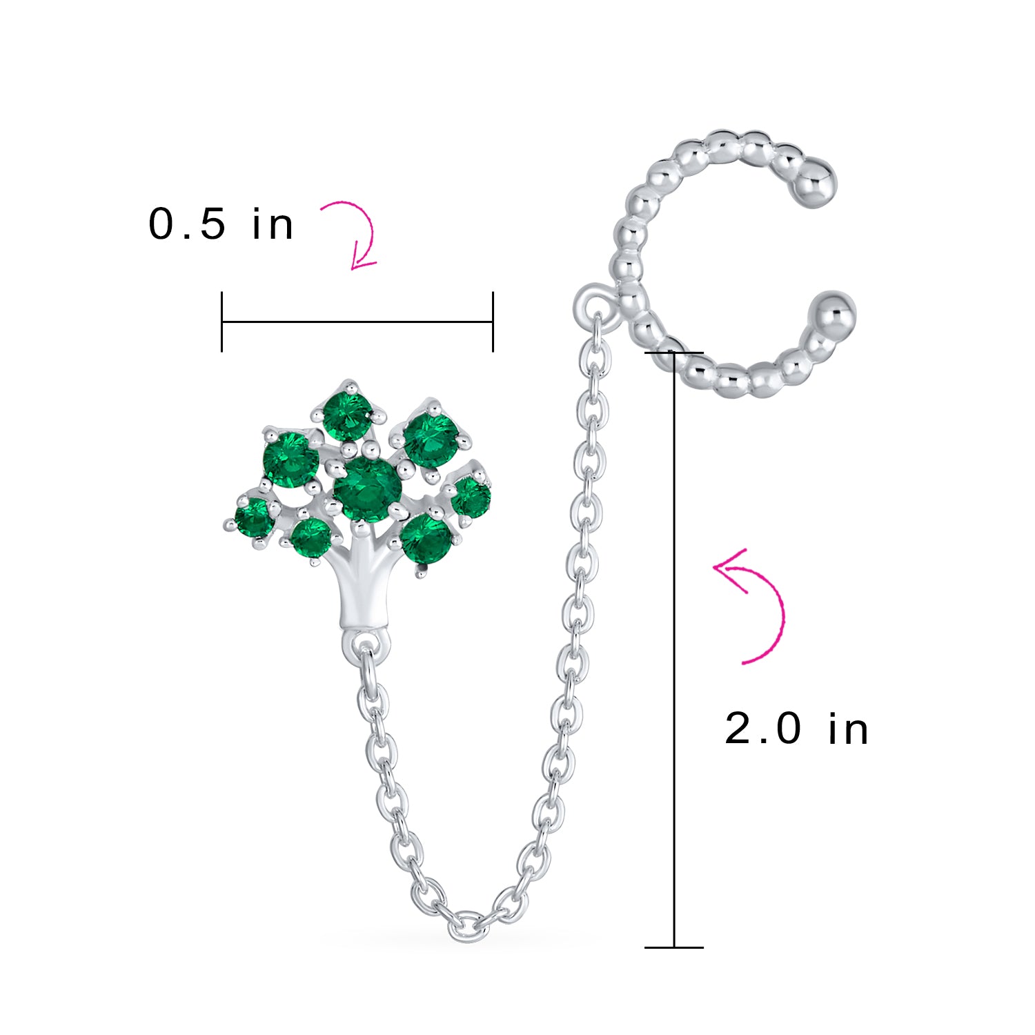 - These radiant and unique drop earrings are crafted from glistening yet affordable .925 sterling silver. Featuring an elegant tree of life design with green CZ stones, they capture attention effortlessly. Be the center of attention and indulge in good fortune with these original earrings. Perfect as a gift for anyone on your list. One cuff connects to a chain, adding a rebellious vibe. Shimmering cubic zirconia stones accent your ear from every angle. Don't miss out on the latest trend in women's earrings.