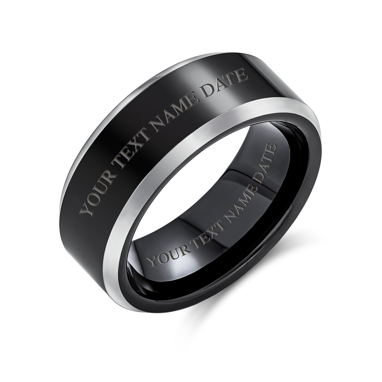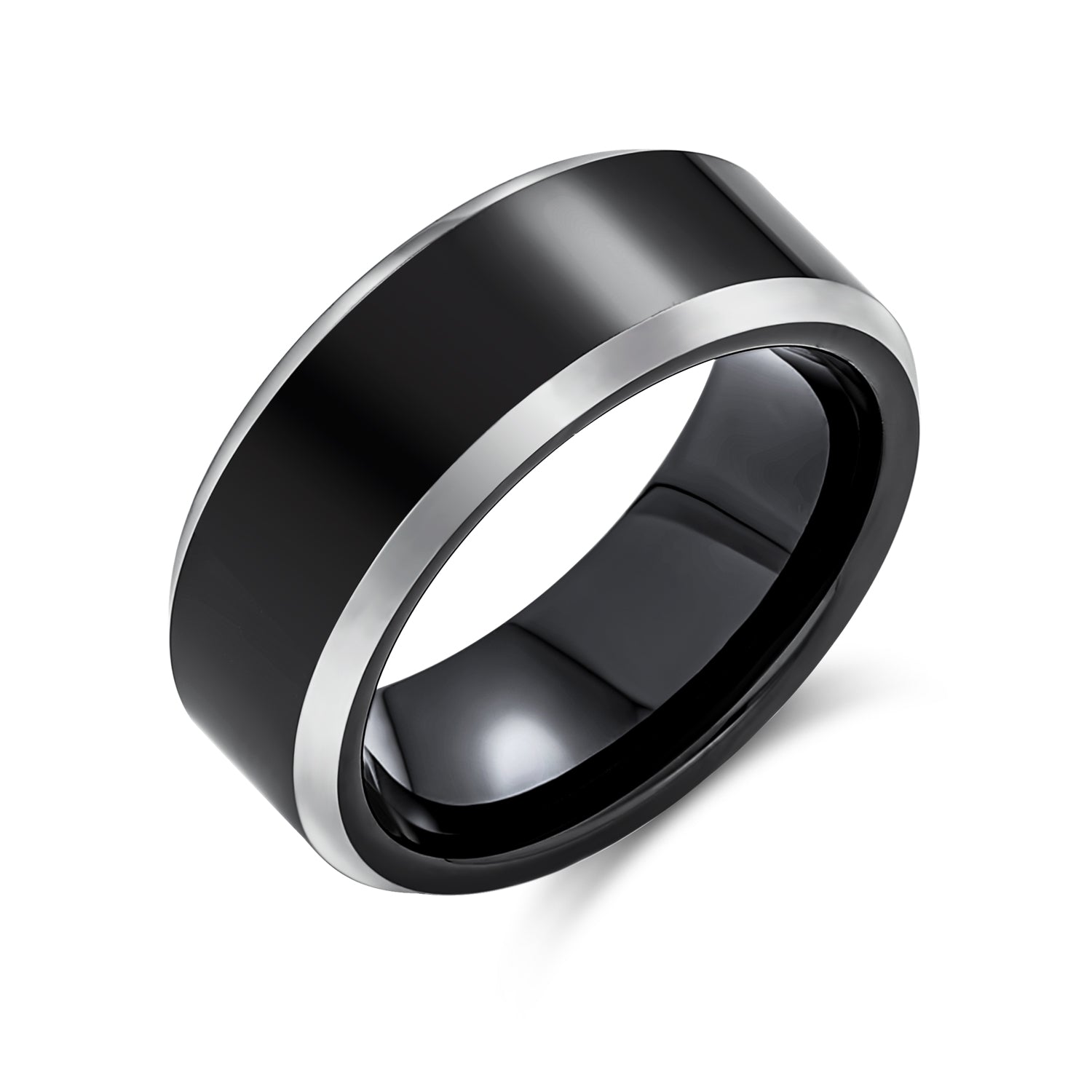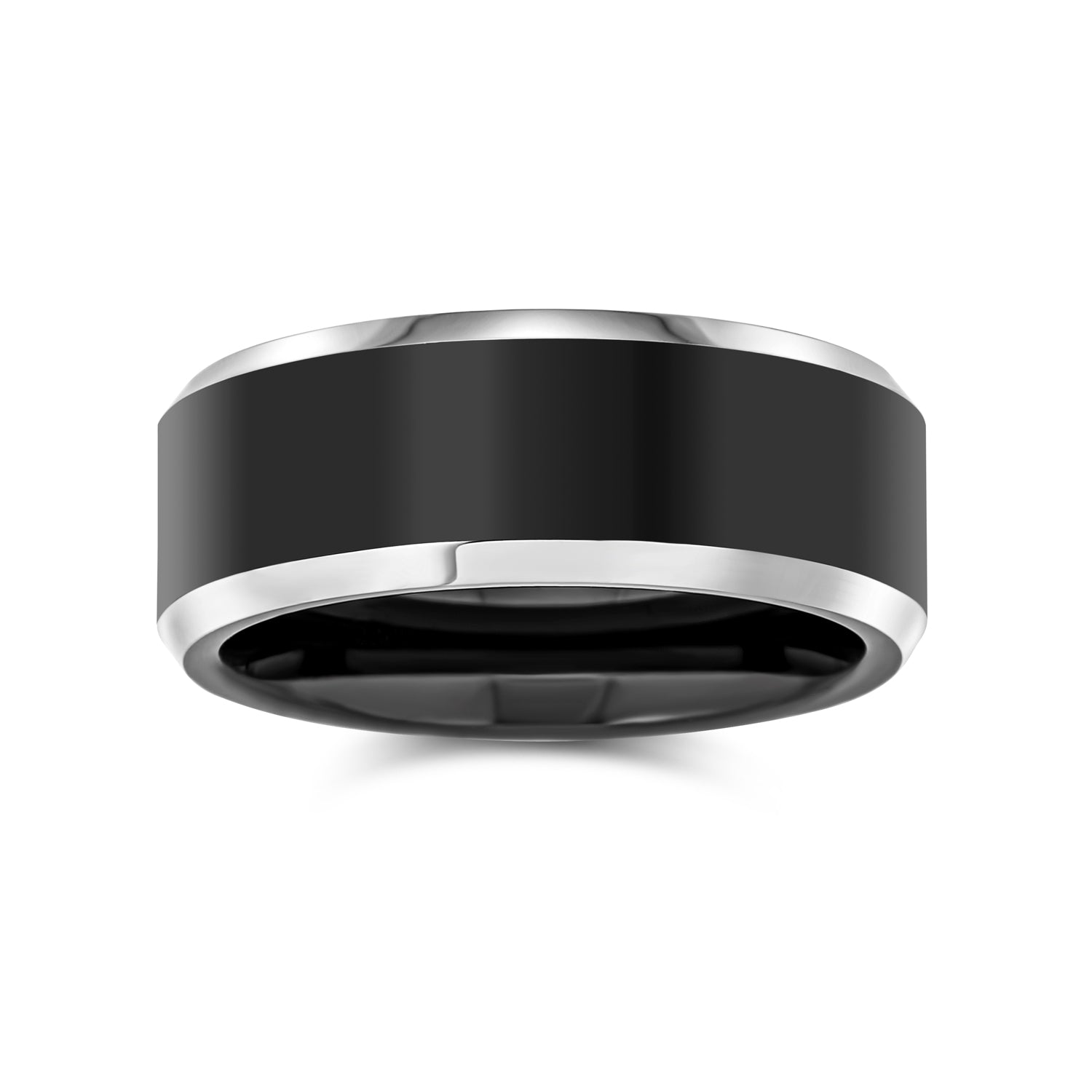 - Elegance and masculinity unite in this stunning men's wedding band. The sophisticated ring features black with a polished finish. Beveled silver edges add a chic, two-tone look. Comfort fit ensures perfect wear. Ideal for Father's Day or anniversary gifts.