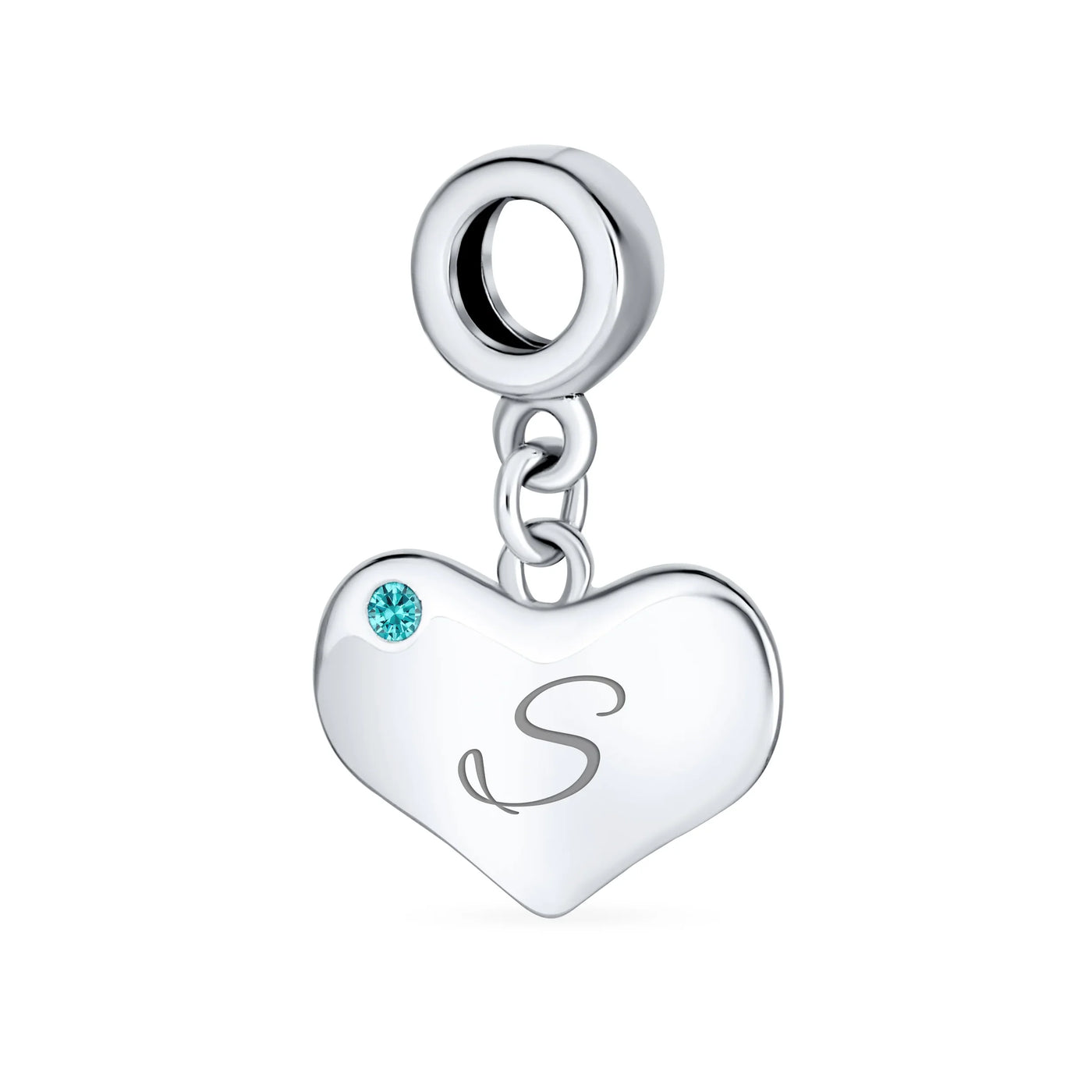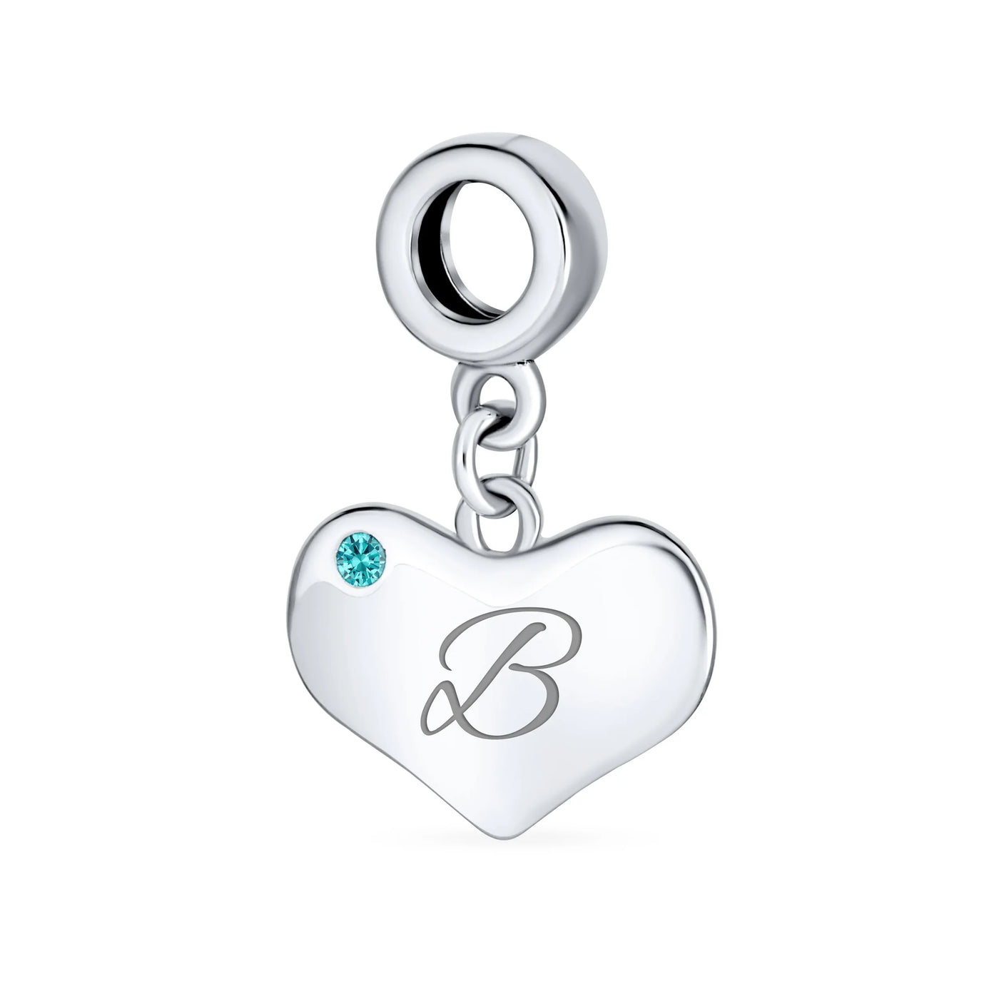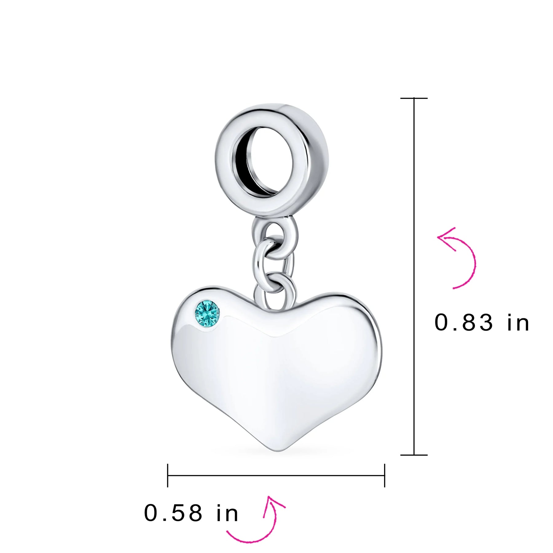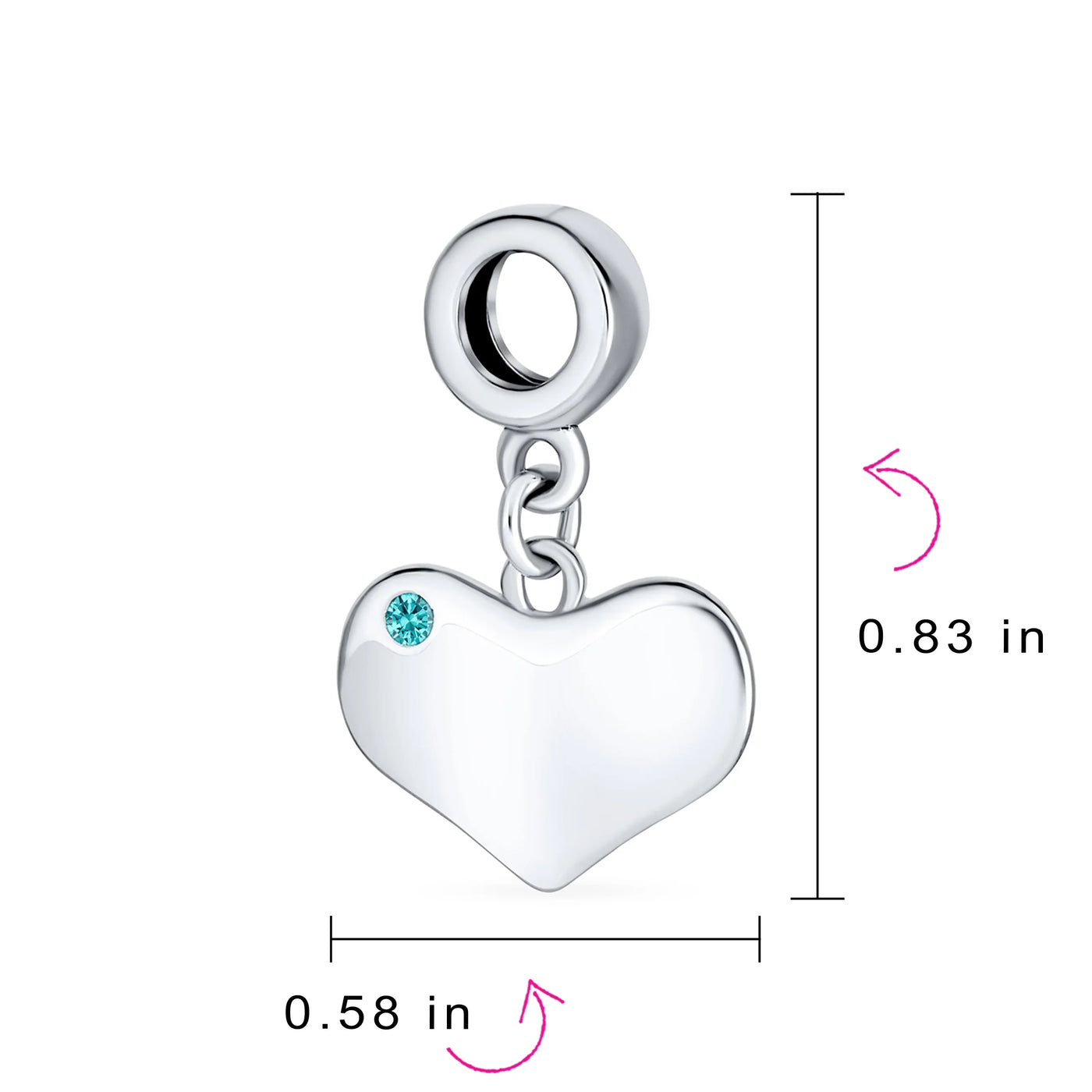 - Move your heart to your beads bracelet with this sterling silver dangle heart charm. Perfect for March birthdays, featuring a simulated Aquamarine crystal. Show your love with this stunning birthstone charm.