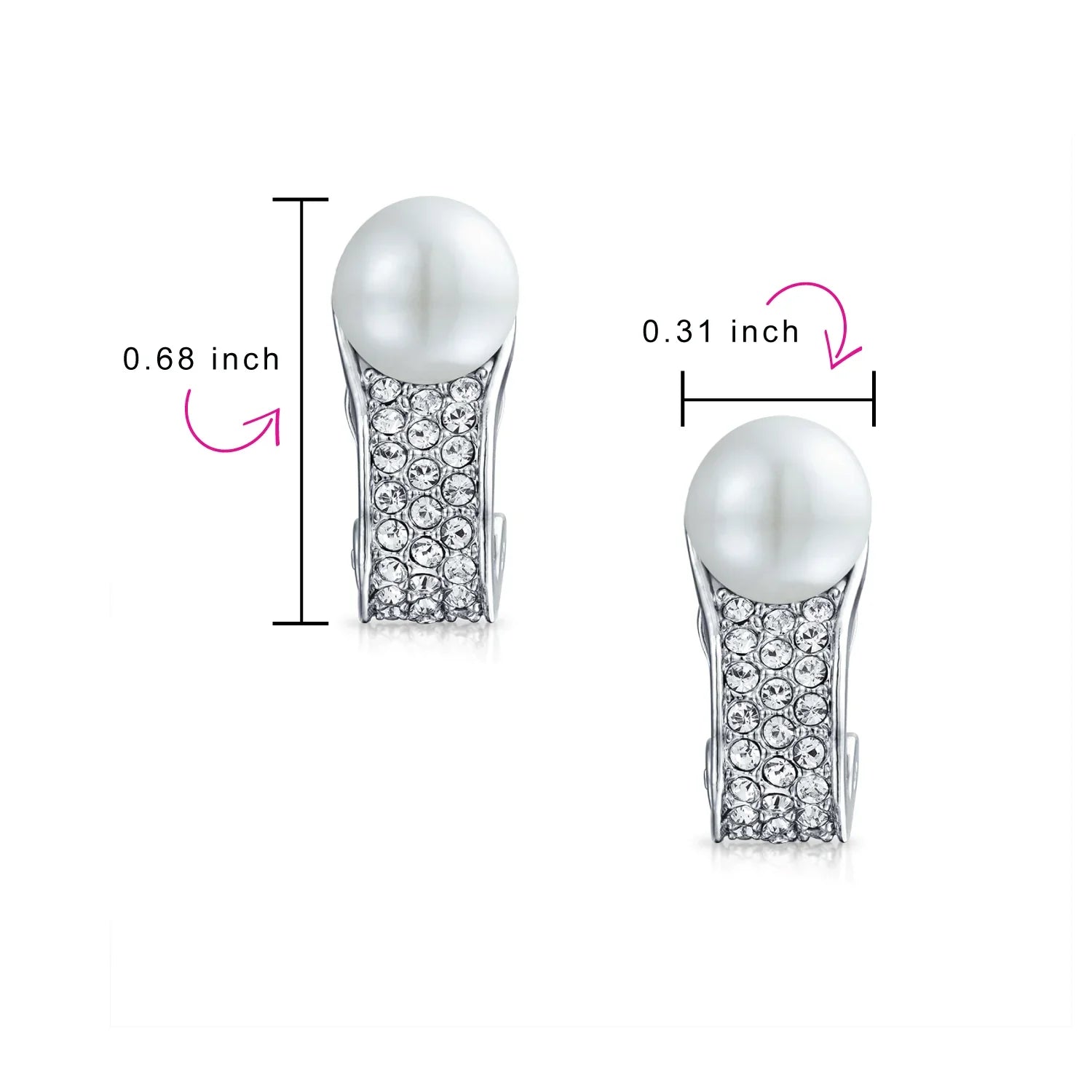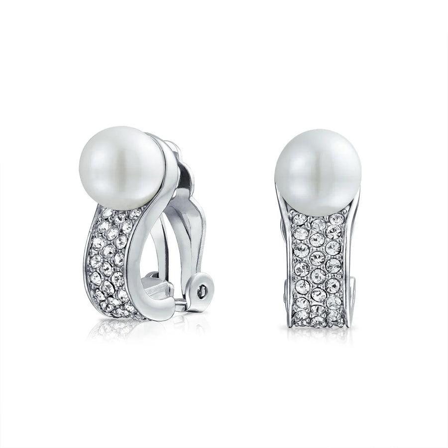 • For that elegant, exquisitely refined look, choose these brass, clip on pearl earring, for non - pierced ears. Glistening, simulated 8mm pearls rest above a plane of dazzling, pave crystals.