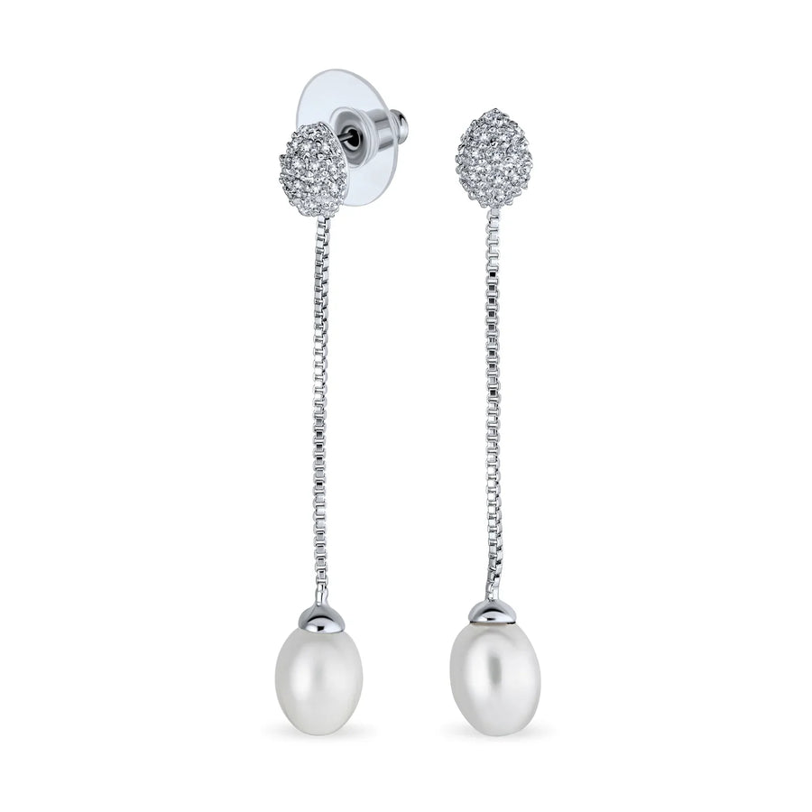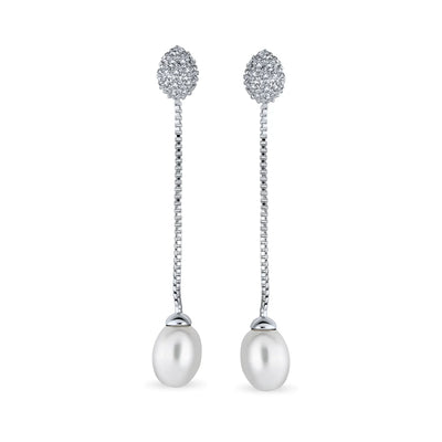 - These elegant freshwater cultured pearl drop earrings are stunning. Oval top encrusted with pave set cubic zirconia stones. Rhodium plated brass long box chain. Sparkling all day, these earrings will get you noticed. Perfect for any occasion.