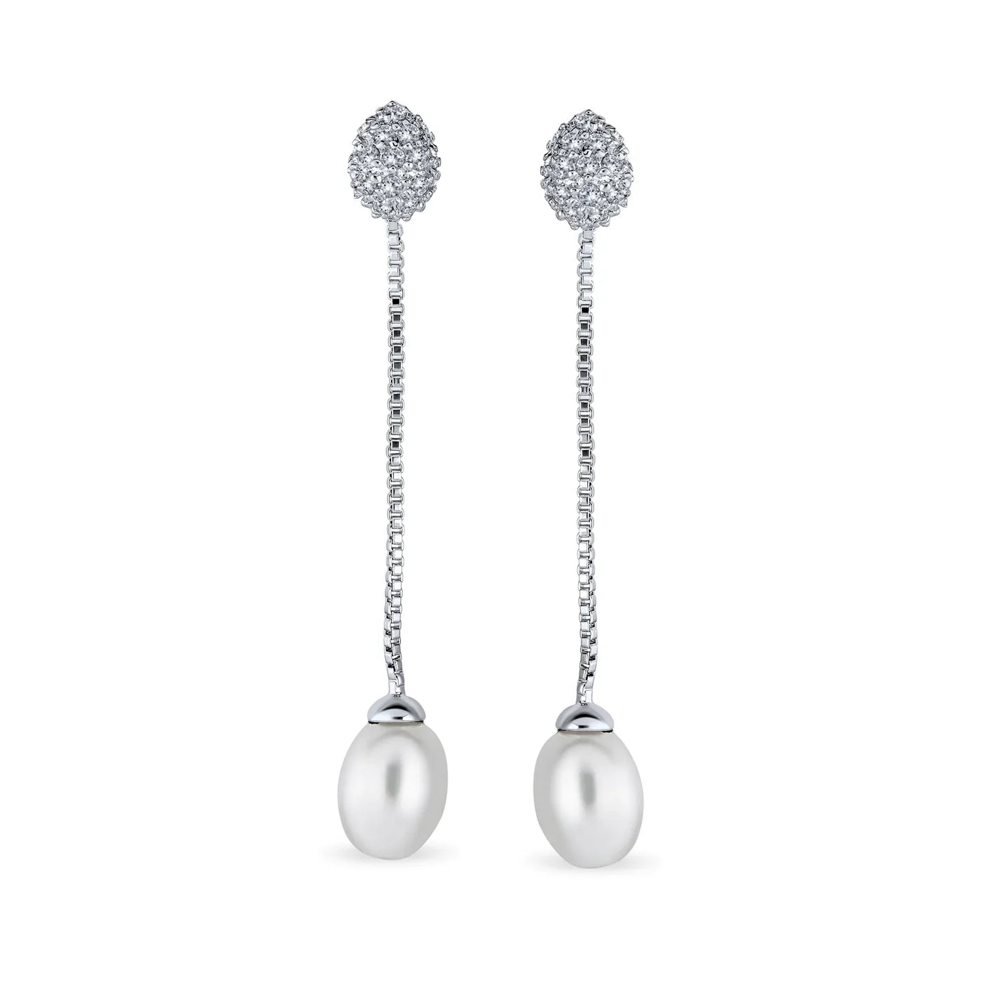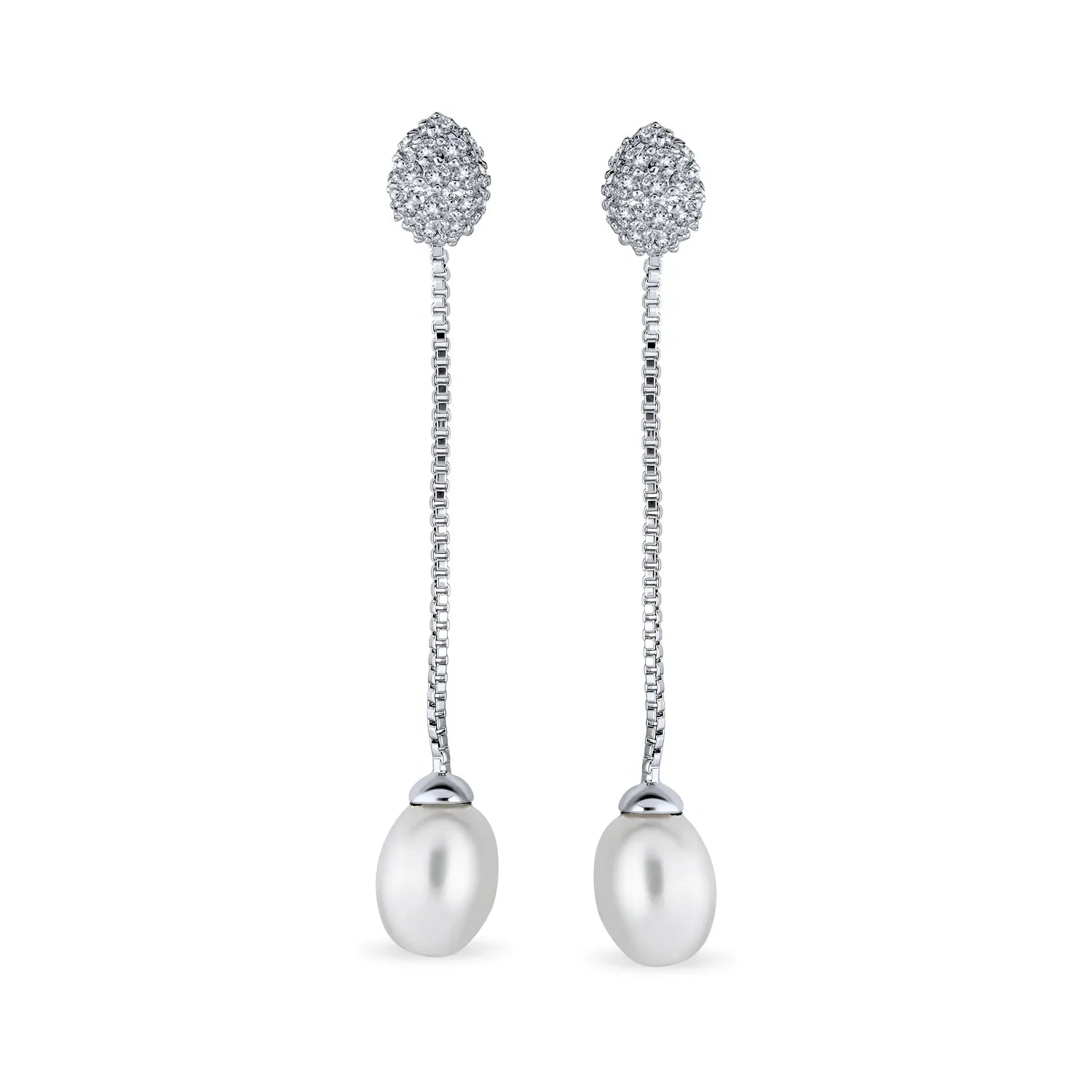 - These elegant brass dangle earrings feature white freshwater cultured pearls on a long box chain, accented with pave set CZ ovals, offering a stunning and timeless style statement.