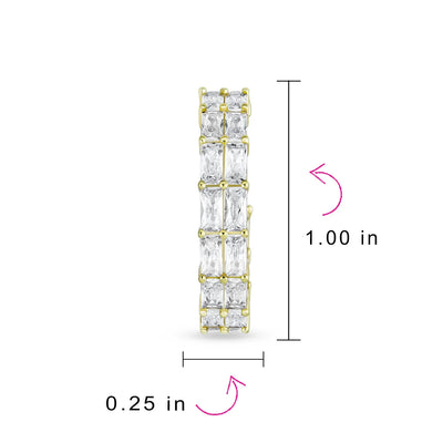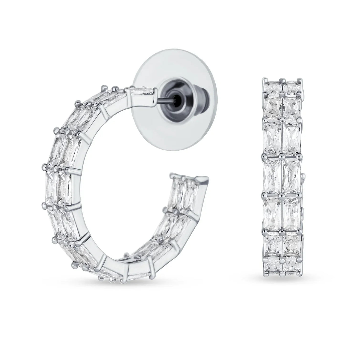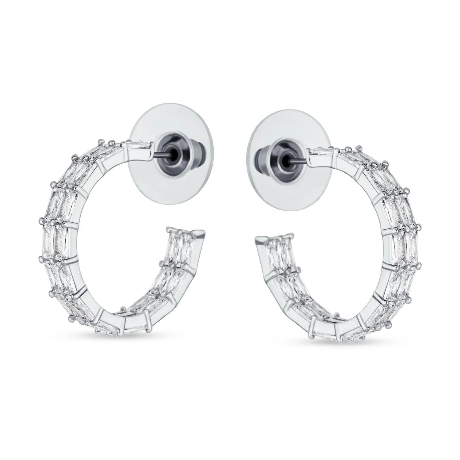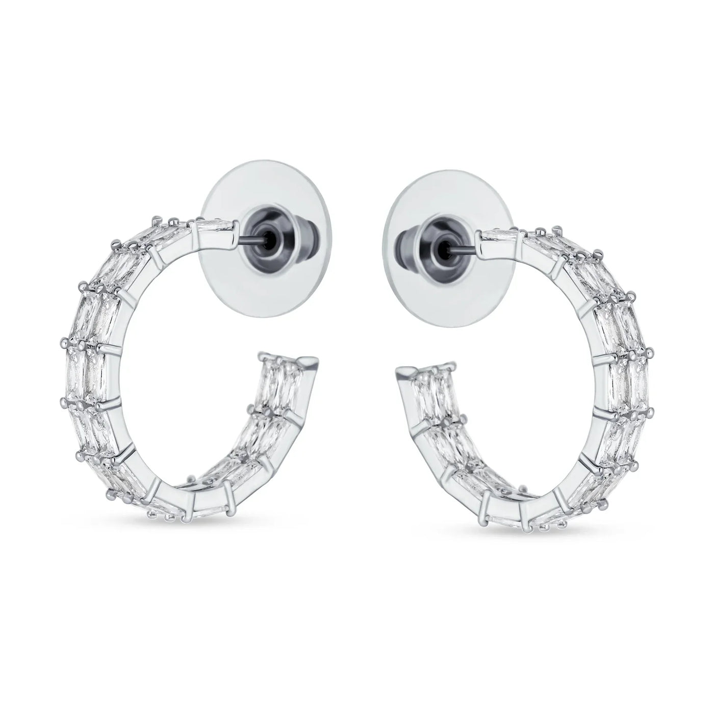 - These stunning bridal hoop earrings are affordable luxury. Rhodium plated with sparkling cubic zirconia rectangles, they exude elegance. Post back closures ensure secure wear, making these silver-toned earrings a must-have for any occasion.