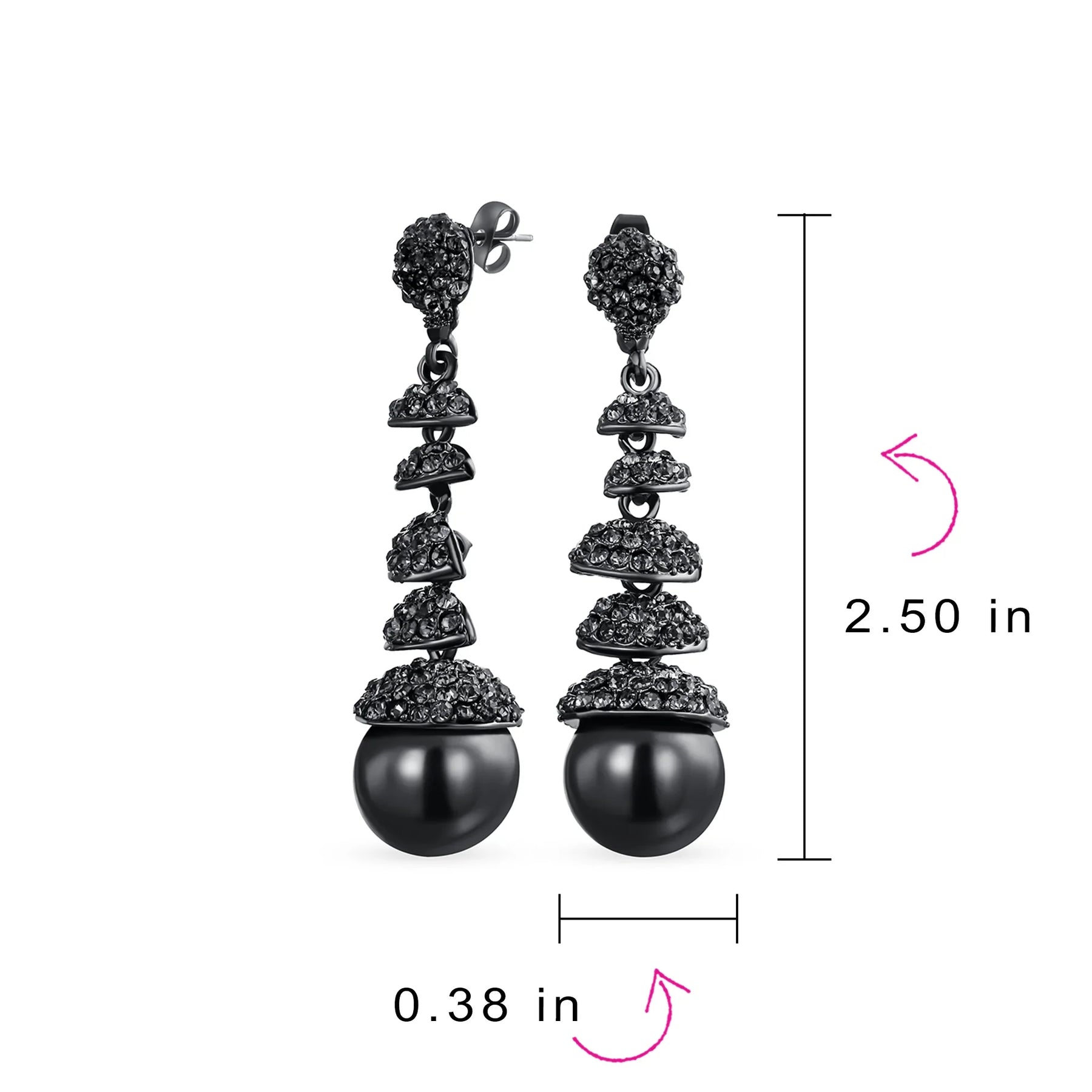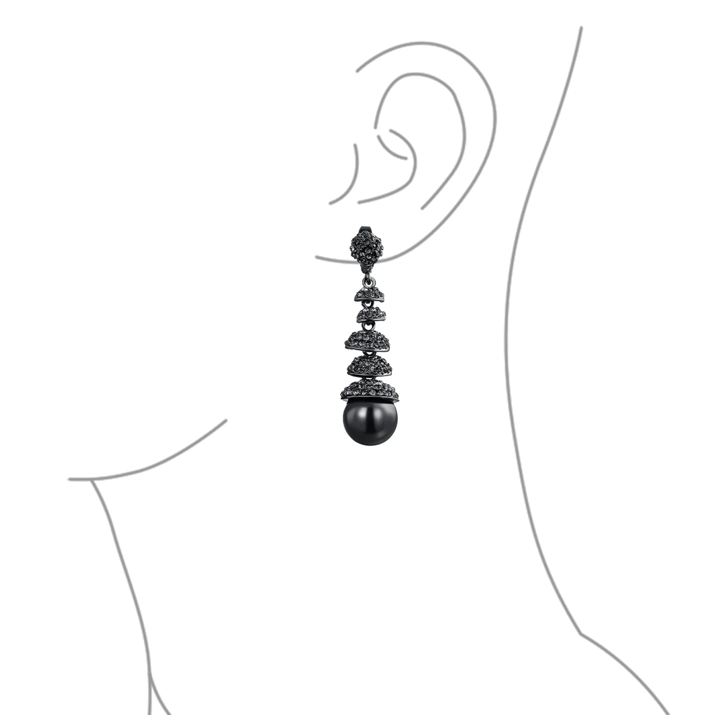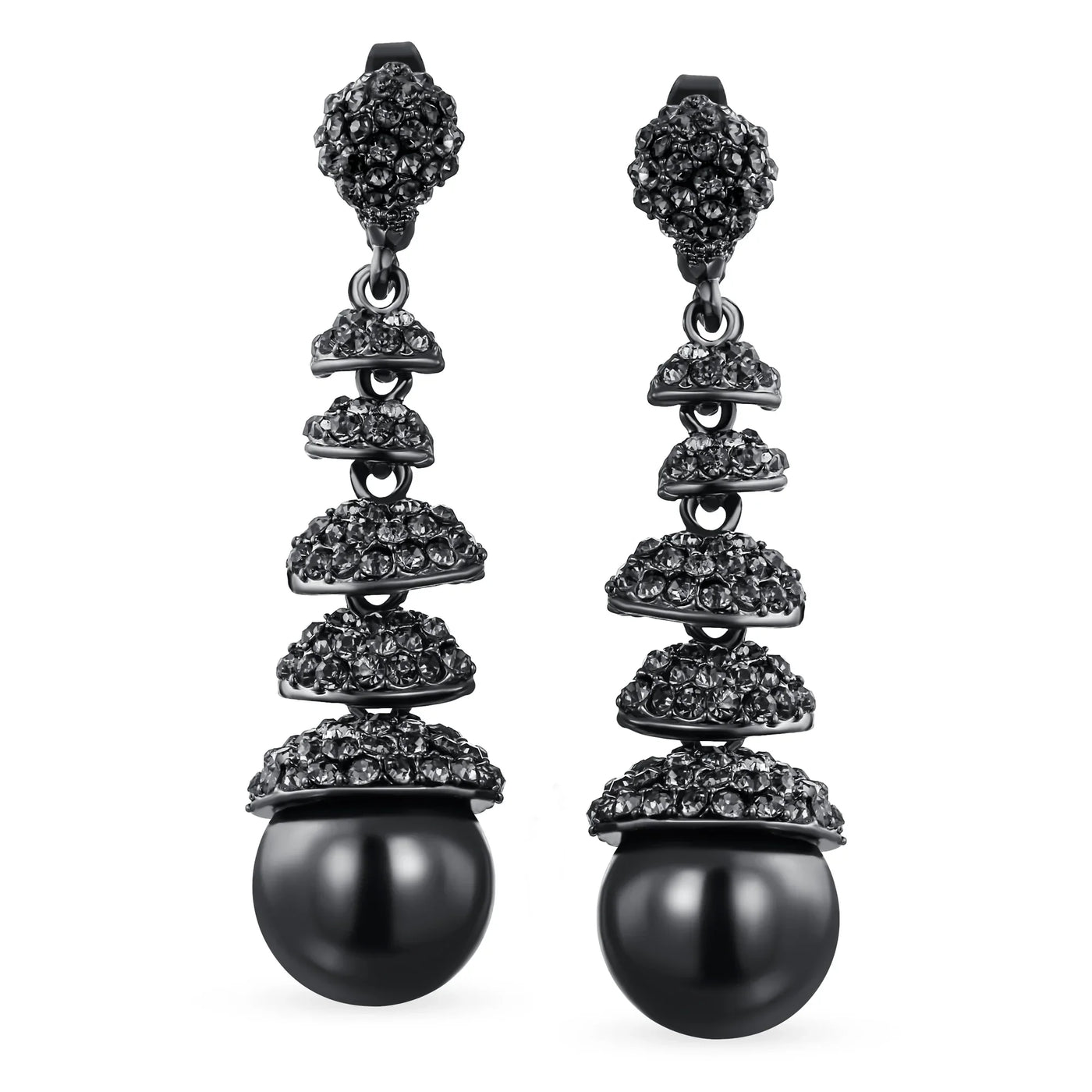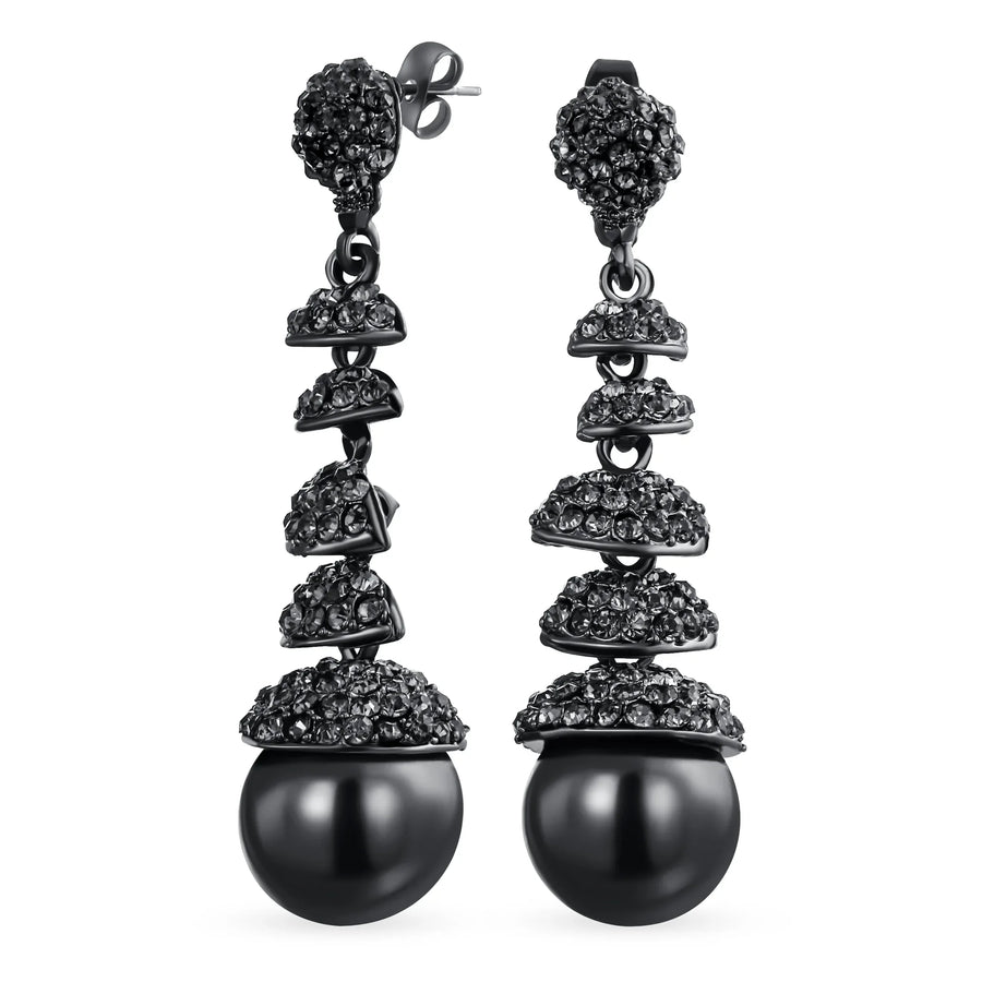 - A stunningly edgy take on traditional wedding jewelry, you will be exquisitely ravishing in these, gunmetal chandelier drop earrings, Accented by a 15mm, black simulated pearl dangling below an awe-inspiring, tiered, pave crystal design.