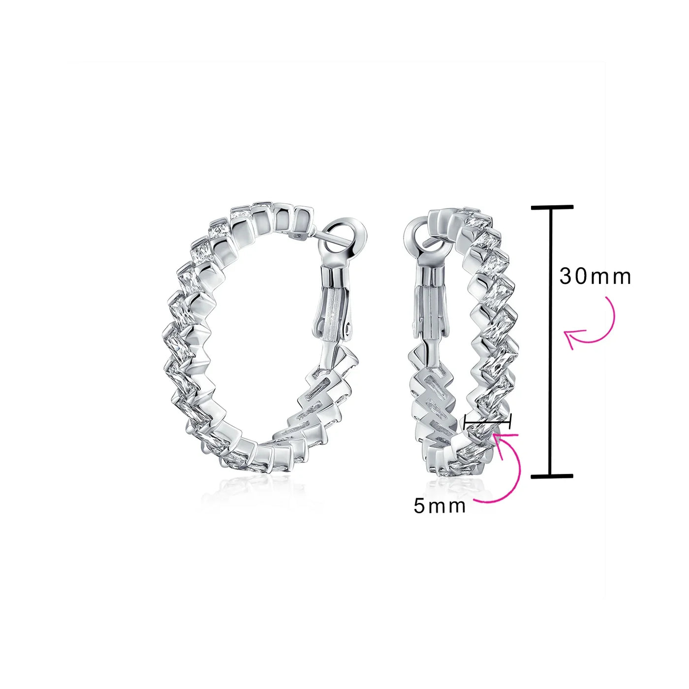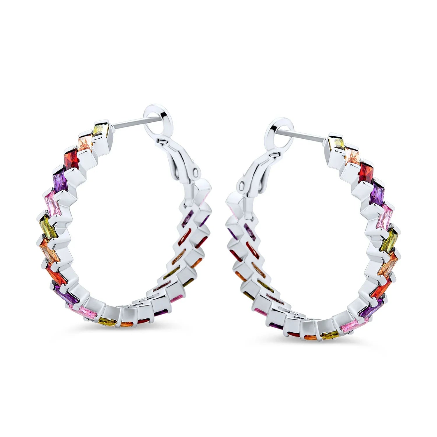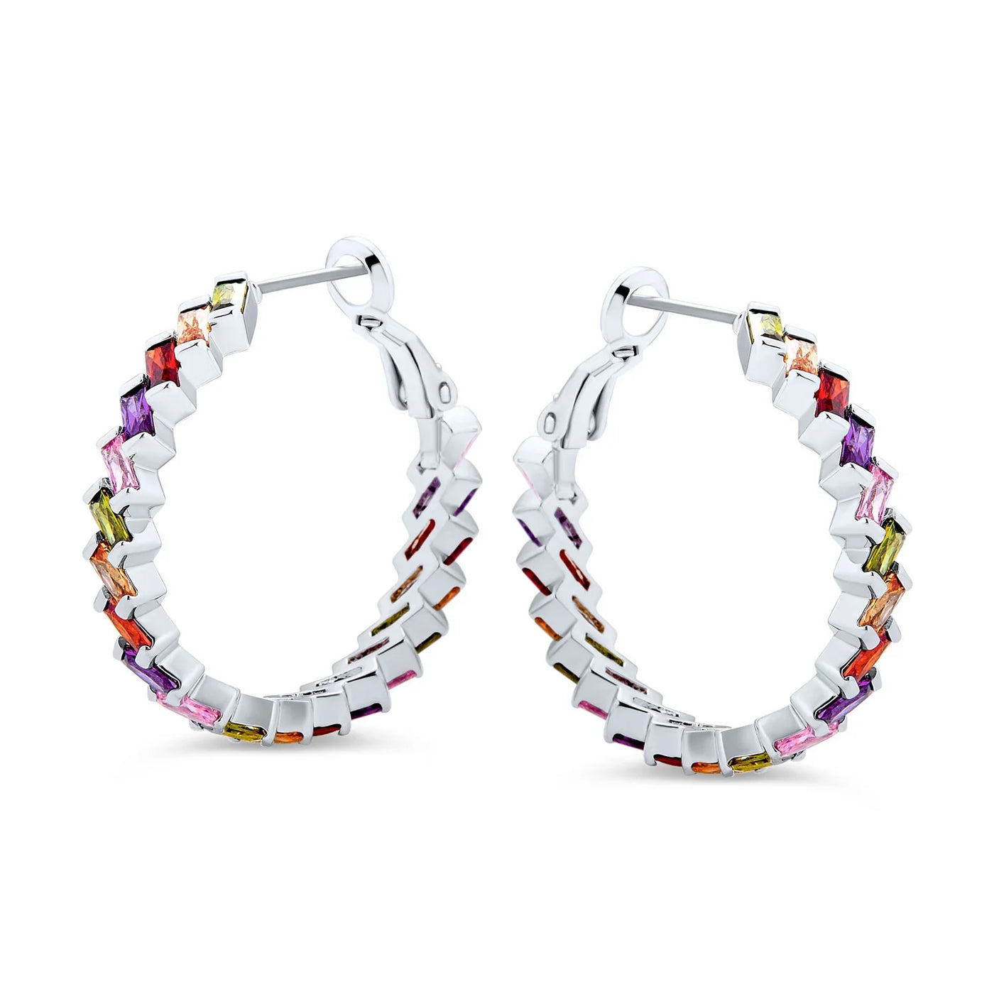 - Make a chic statement with our CZ Baguette hoop earrings. Perfect with khakis, beiges, and whites in warm weather. Sparkling cubic zirconia hoops with omega backs ensure a secure, comfortable fit. Dazzle this summer with light-catching CZ hoop earrings.