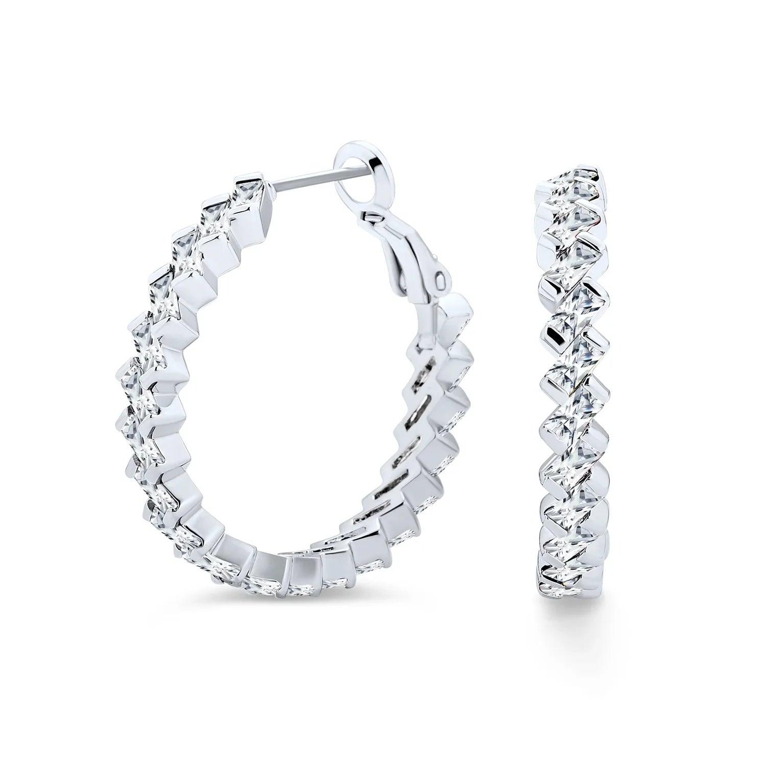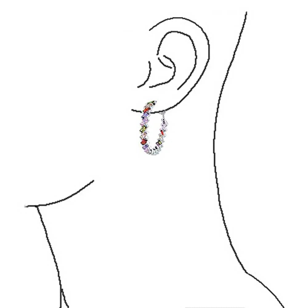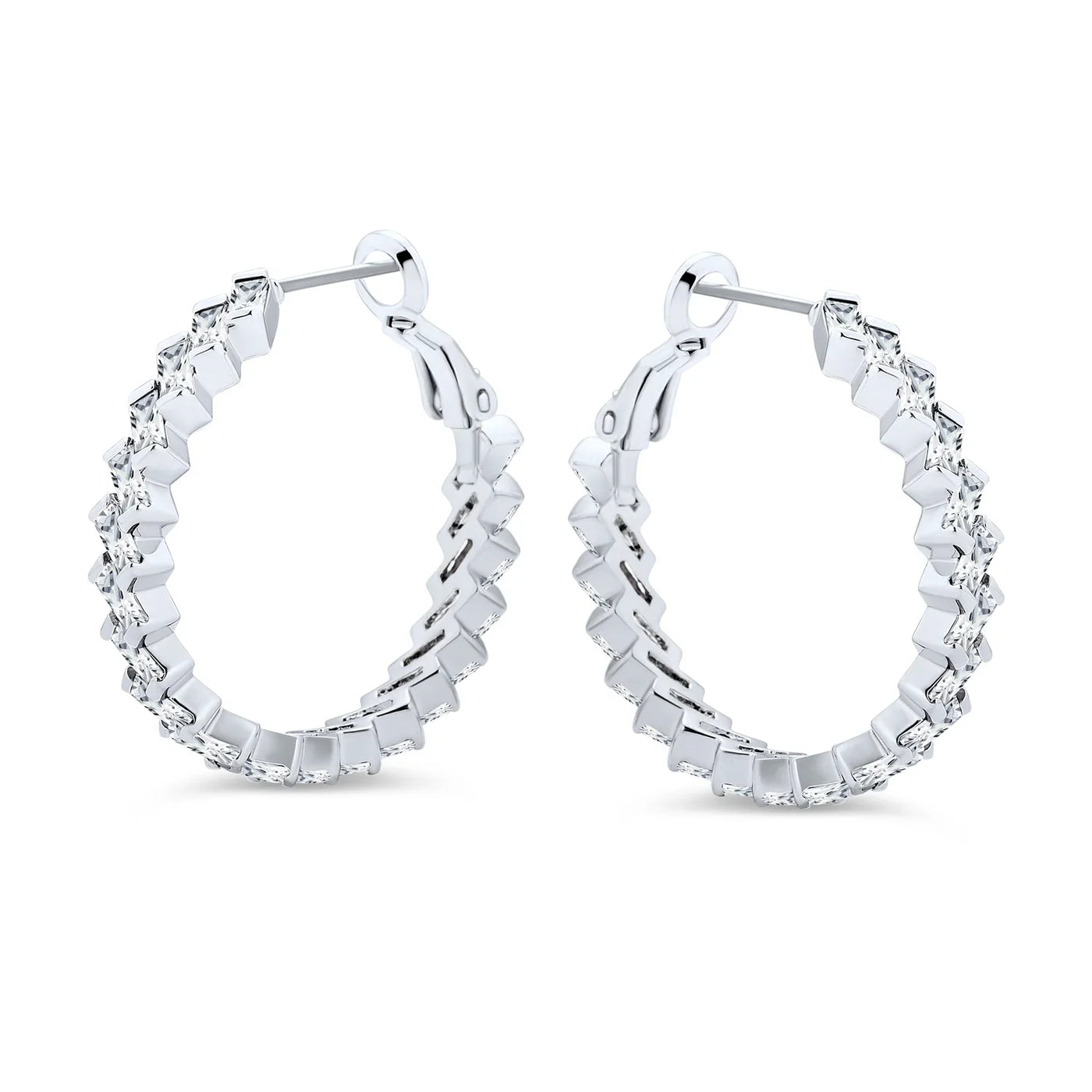 - Make a chic statement with our CZ Baguette hoop earrings. Perfect with khakis, beiges, and whites in warm weather. Sparkling cubic zirconia hoops with omega backs ensure a secure, comfortable fit. Dazzle this summer with light-catching CZ hoop earrings.