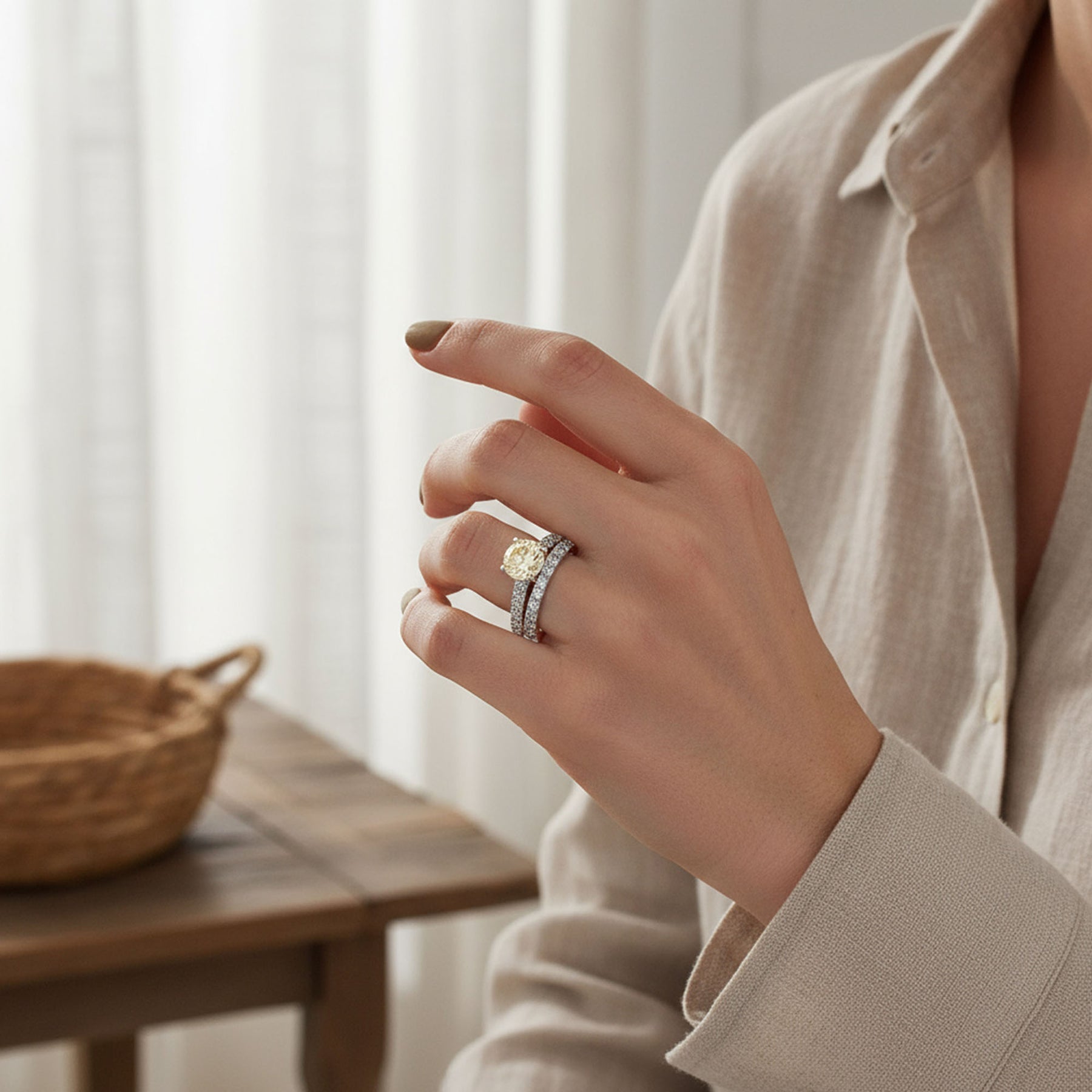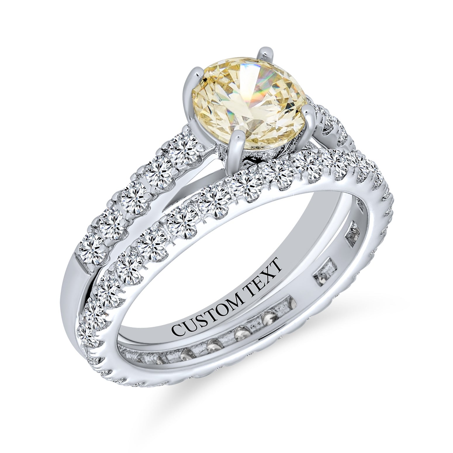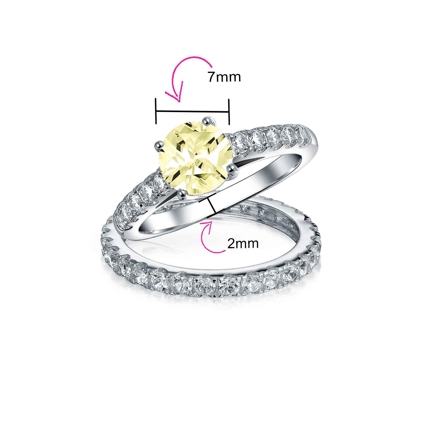 - Pale Light Yellow Canary Round Solitaire Brilliant Cut CZ Cathedral Set Engagement Wedding Ring Set with Classic 1MM Eternity Band. Hypoallergenic, lead-free, and nickel-free; each piece is stamped .925 to ensure quality and craftsmanship.