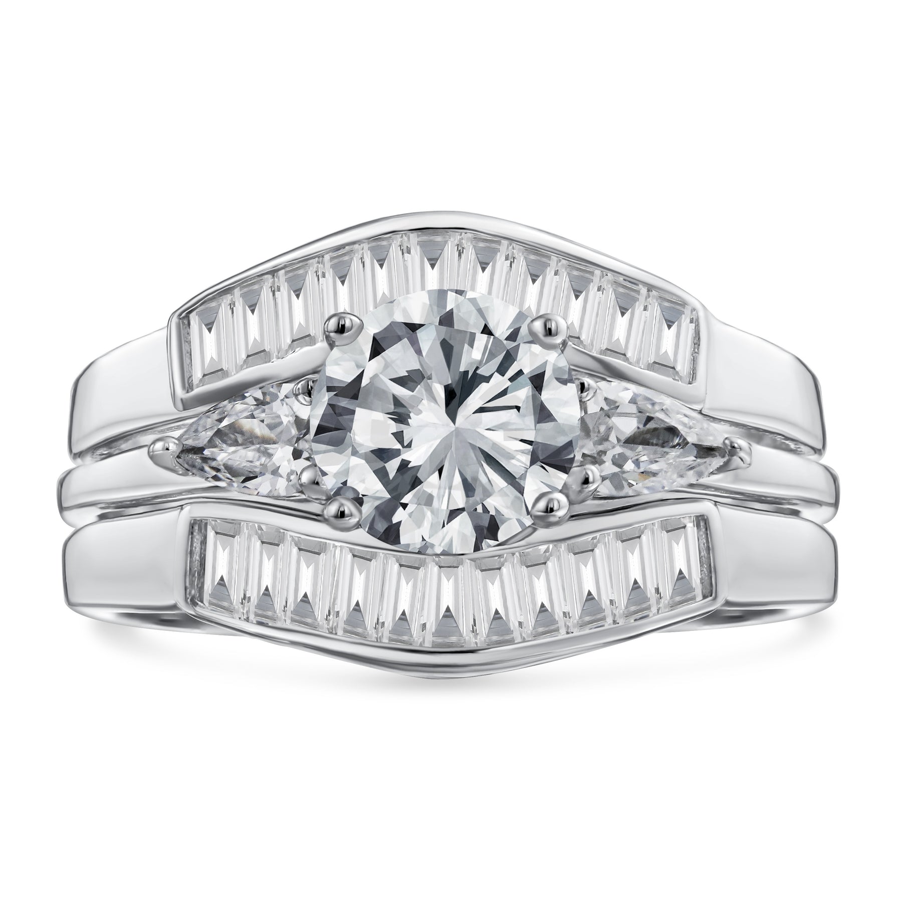 • A perfect bridal party gift, this stunning wedding and engagement ring set is crafted from .925 sterling silver. The round cut center stone is flanked by teardrop side stones, with baguette cut CZ accents on the bands. Rhodium plating ensures lasting shine and brilliance. Designed for elegance, this piece will make your wife eternally happy.