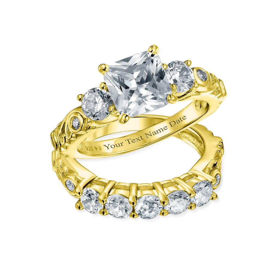 - BRIDAL RINGS - Win her heart with this lustrously alluring, gold plated sterling silver wedding ring set. Including a sweetly stunning, round cut cz elegant engagement ring with shimmering princess cut channel czs on either side and on matching fashion wedding band. PERSONALIZE – Engrave with a word, inspirational, letters, numbers, date, coordinates with script or block letters, our precision machine engraving ensures that your message is beautifully displayed. Click Customize Now to Order. HYPOALLERGENIC - Lead free Nickle-free. Each piece is stamped .925 guarantees the quality and craftmanship.