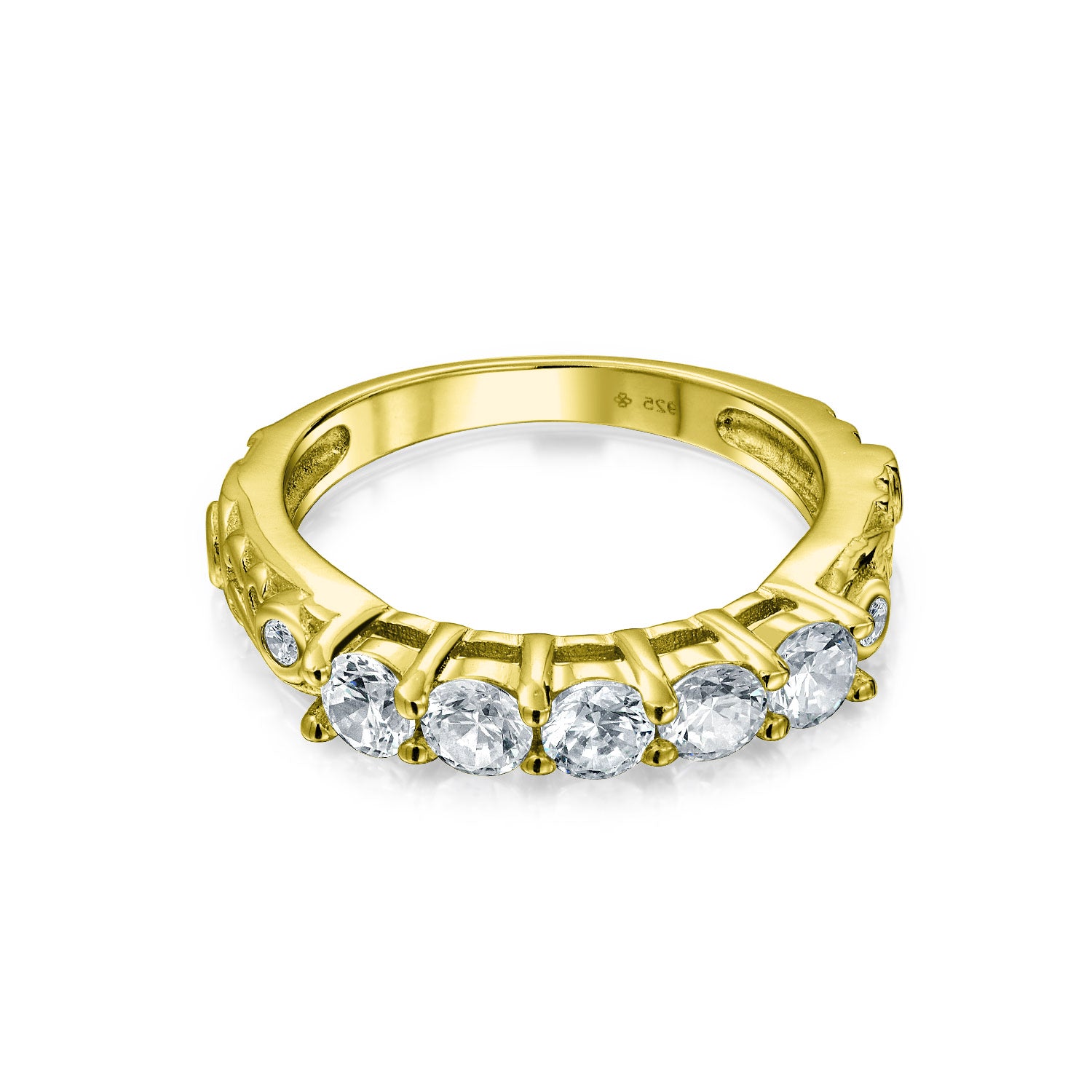 - Measure: Approx: 2.5mm Each Band Width, Center Stone 7mm W, Weight: 7.5 Grams Material: Genuine .925 Sterling Silver Yellow 14K Gold Plated, Cubic Zirconia, HYPOALLERGENIC - Lead-Free Nickle-free. Each piece is stamped