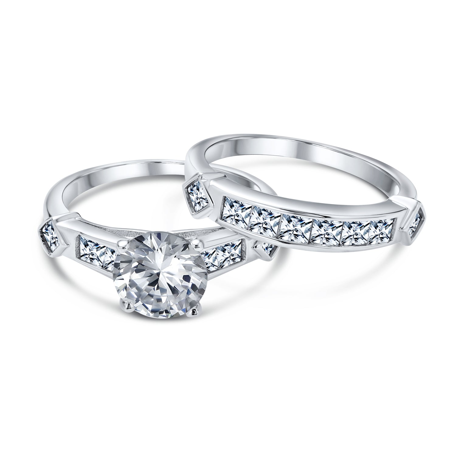 - Make her dreams come true with our sparkling engagement rings and wedding bands. This sterling silver set features gleaming bands and colorless CZ stones. The wedding rings have a half pave band with glittering stones. The engagement rings boast a stunning 2-carat CZ center stone. Order our engagement ring set and prepare for her to say Yes and I Do.