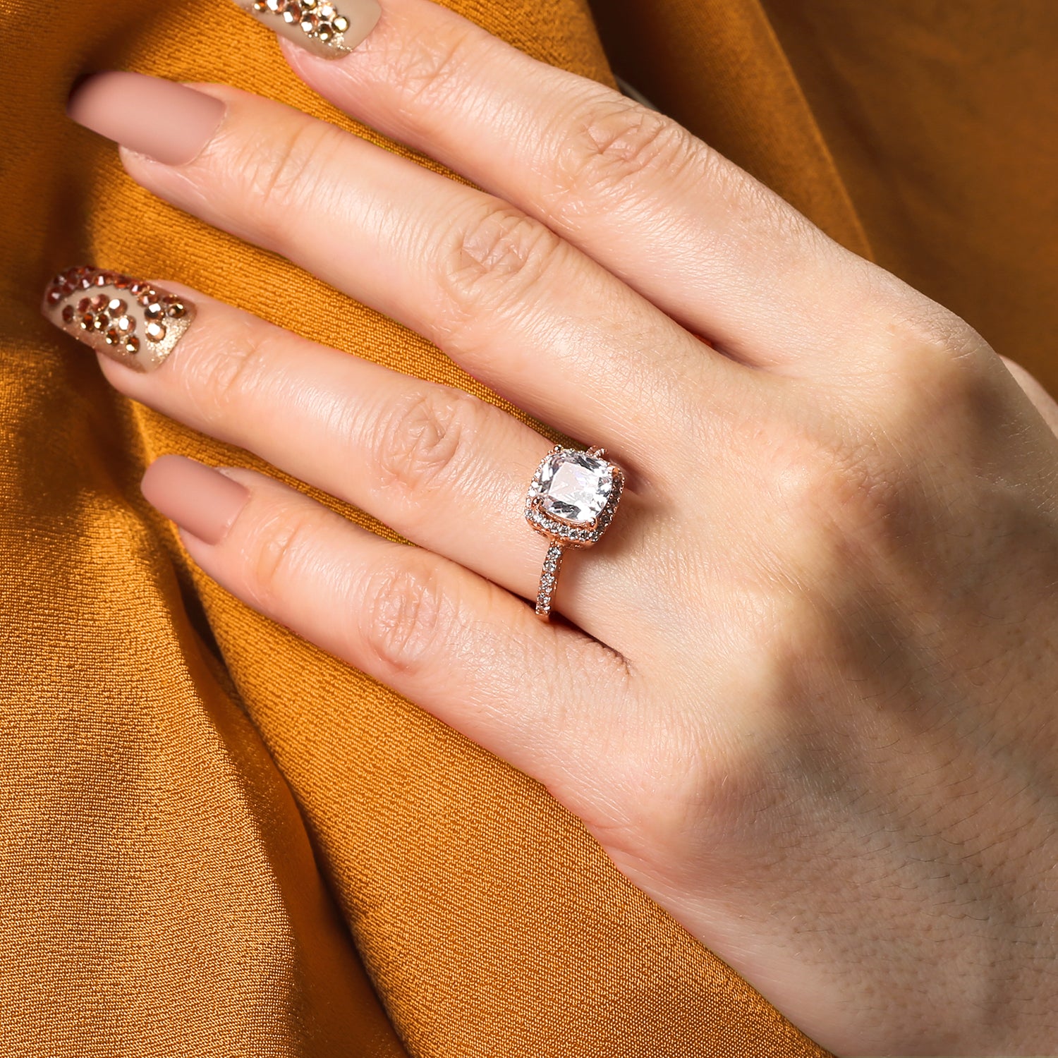 - A timeless ring for a sophisticated woman. Our sterling silver engagement rings feature high profile settings for ultimate glamour and sparkle. The micro pave band shines brilliantly with dazzling cz stones. The centerpiece is a 7mm cushion cut clear cz stone. Flanked by round cut white cz stones, it exudes elegance. Perfect for those who adore vintage glamour. Order this stunning colorless cz fine jewelry today and embrace retro chic.