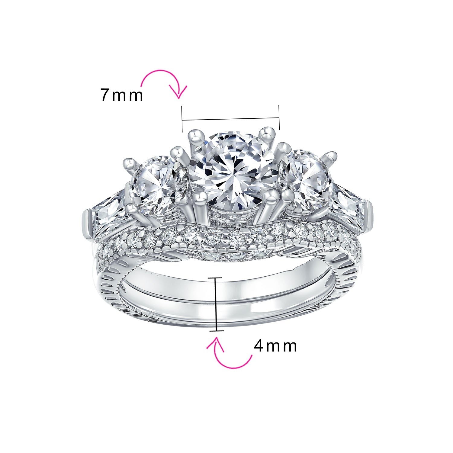 - Celebrate timeless love with this Art Deco-inspired 3CT CZ engagement and wedding ring set. Crafted from rhodium-plated .925 sterling silver, the engagement ring features three sparkling stones symbolizing the past, present, and future, complemented by two elegant baguette side stones. The matching CZ-encrusted wedding band completes the set, offering a stackable, sophisticated design ideal for proposals, anniversaries, or Valentine’s Day gifts. Hypoallergenic, lead- and nickel-free, this ring set ensures comfort and durability while maintaining a brilliant shine. Personalize this meaningful set with engraved names, dates, or messages to create a cherished keepsake for your beloved bride-to-be.