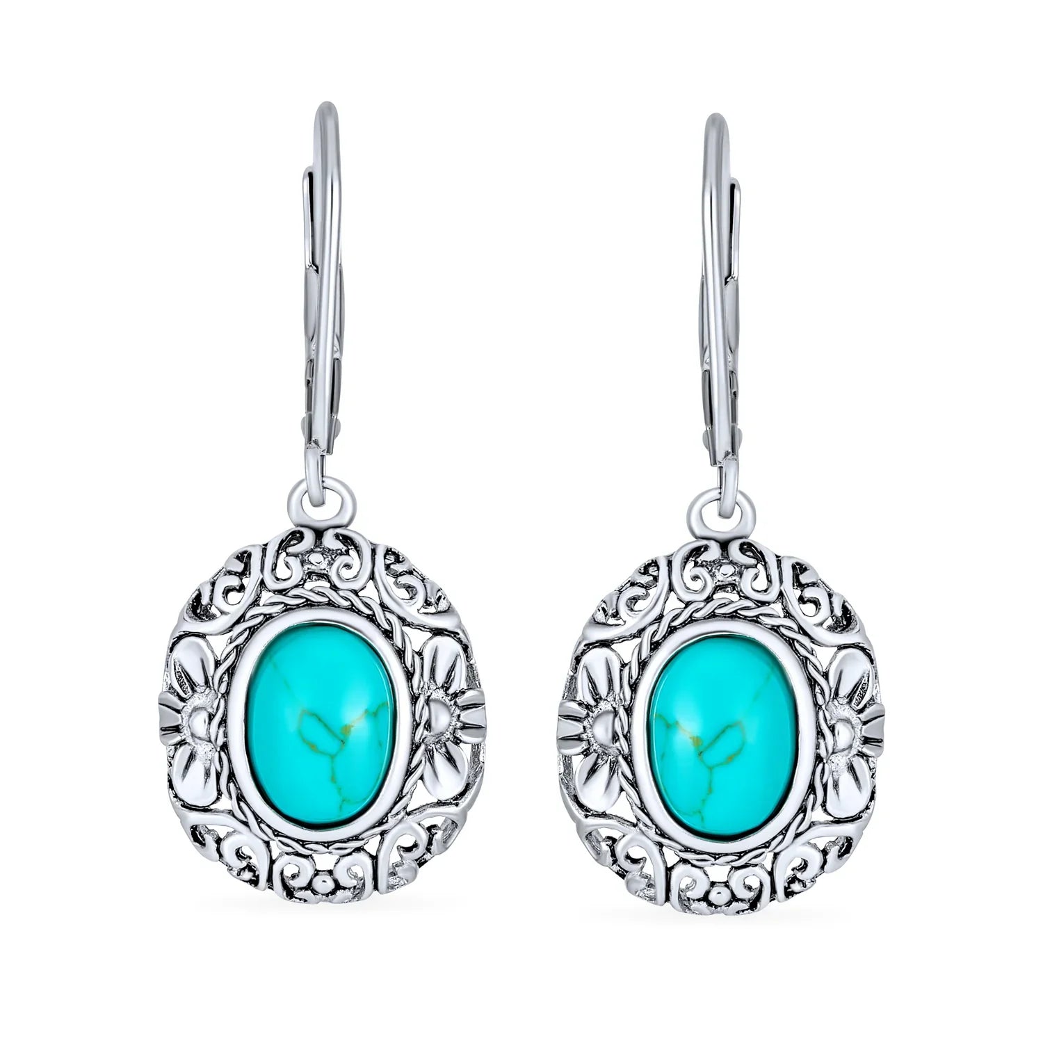 - Enhance your style with these stabilized aqua turquoise oval drop earrings, featuring an antiqued milgrain bezel set frame, perfect for gifting December birthdays.
