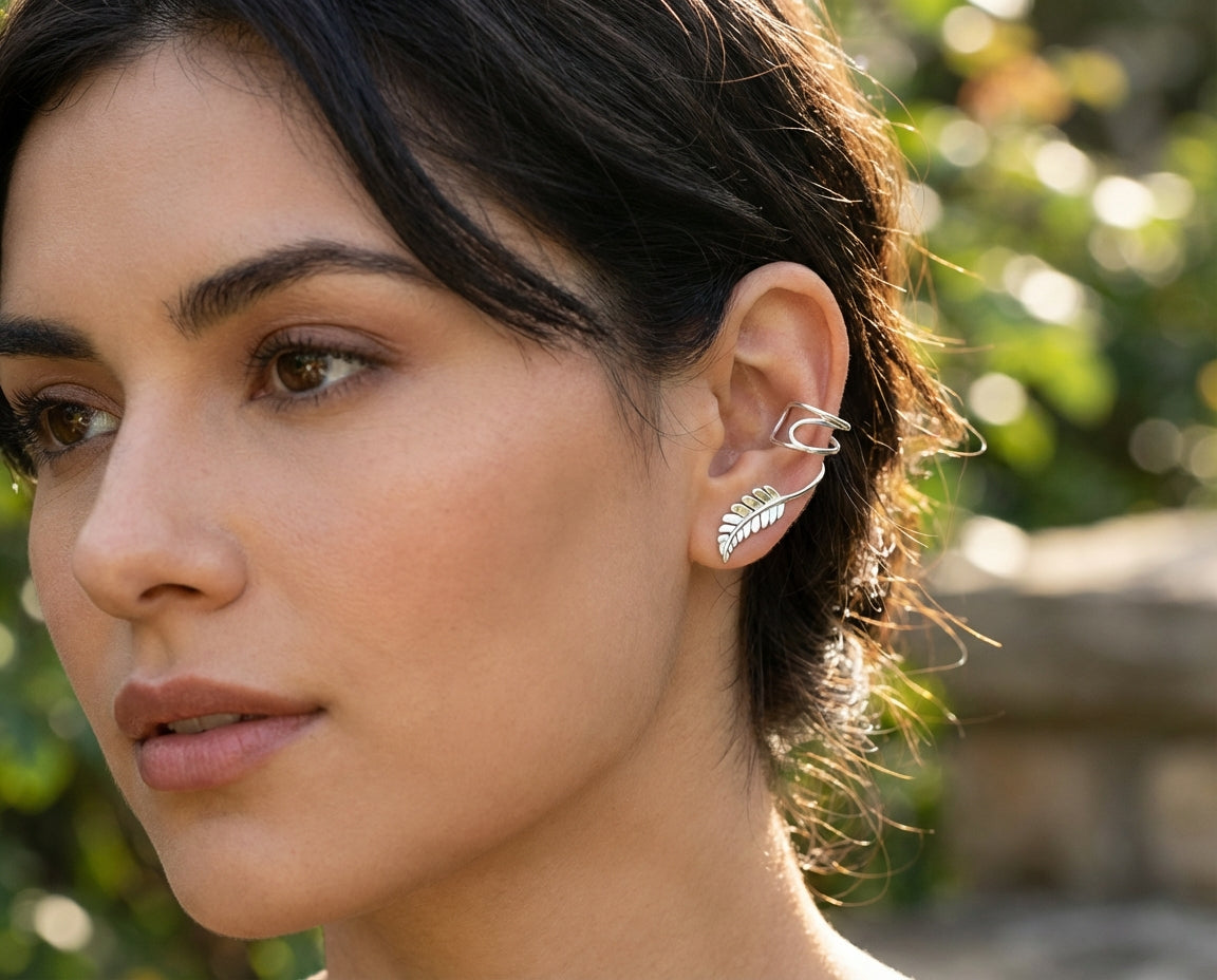 - For boho chic vibes exuding stunning, earthy appeal choose these charming, .925 silver ear cuff earrings. Featuring a beautifully designed feather leaf motif, inspired by nature, with intricate detail and a delicately curving, ear cuff design.
