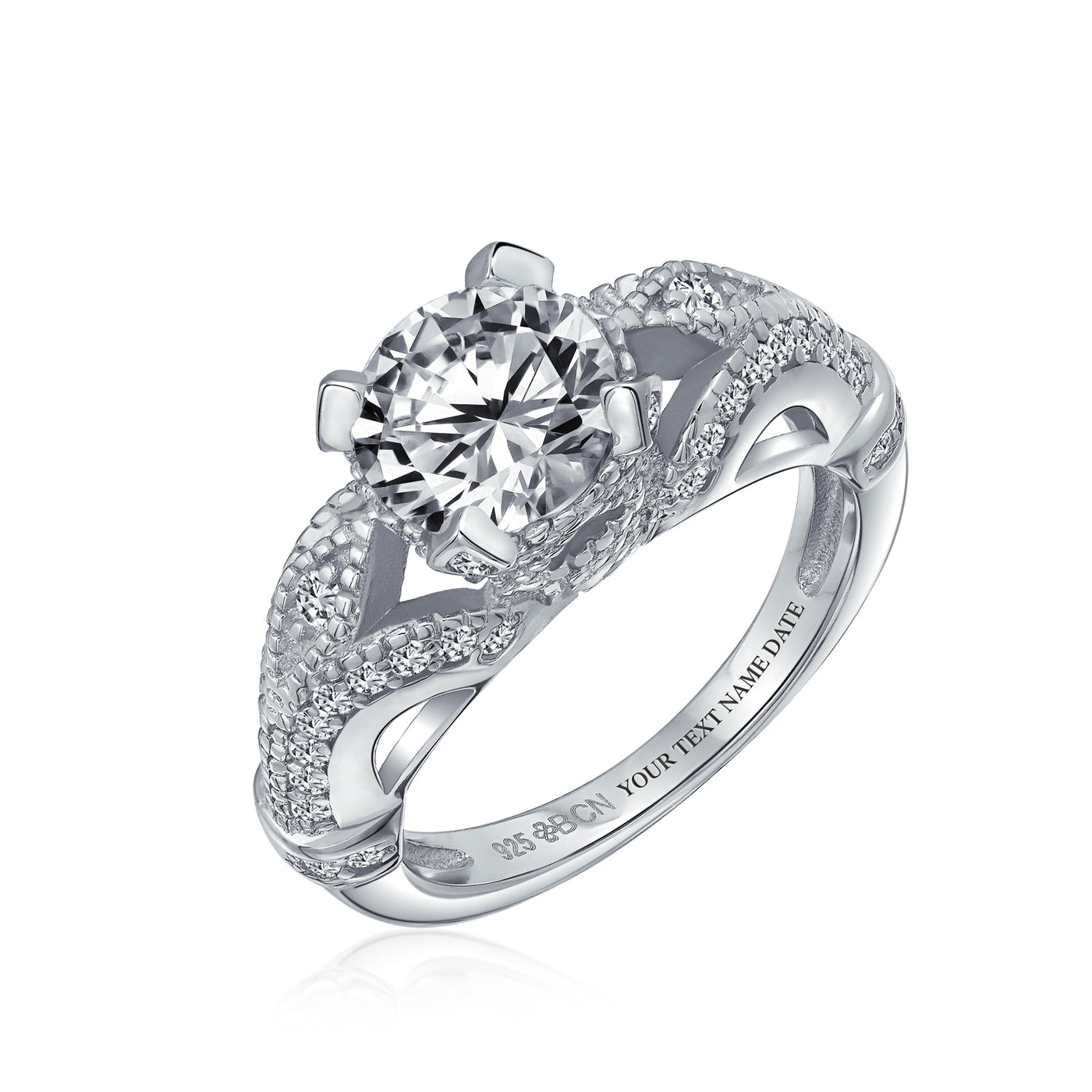 - Experience timeless romance with this vintage-style engagement ring, featuring a captivating 3ct round cut CZ solitaire and Victorian-inspired CZ accents on a shimmering .925 silver band.