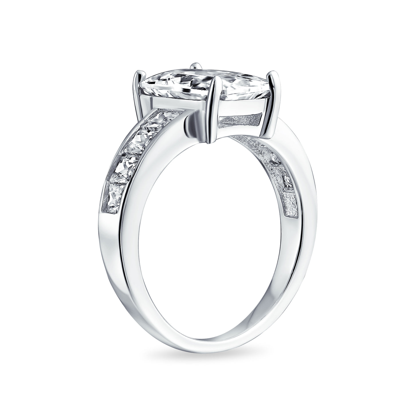- Elevate your style with our Emerald Cut CZ jewelry. Our sterling silver engagement rings make you sparkle with elegance. Celebrity-inspired rings add sophistication to your look. Featuring a 3.5 carat Emerald Cut cubic zirconia, this bridal ring is eye-catching. Flanked by channel set baguette CZs, it shines brilliantly. Crafted from .925 sterling silver and rhodium plated, it resists tarnish. This baguette side stone ring maintains its shine for years. Perfect for weddings or everyday glamour.