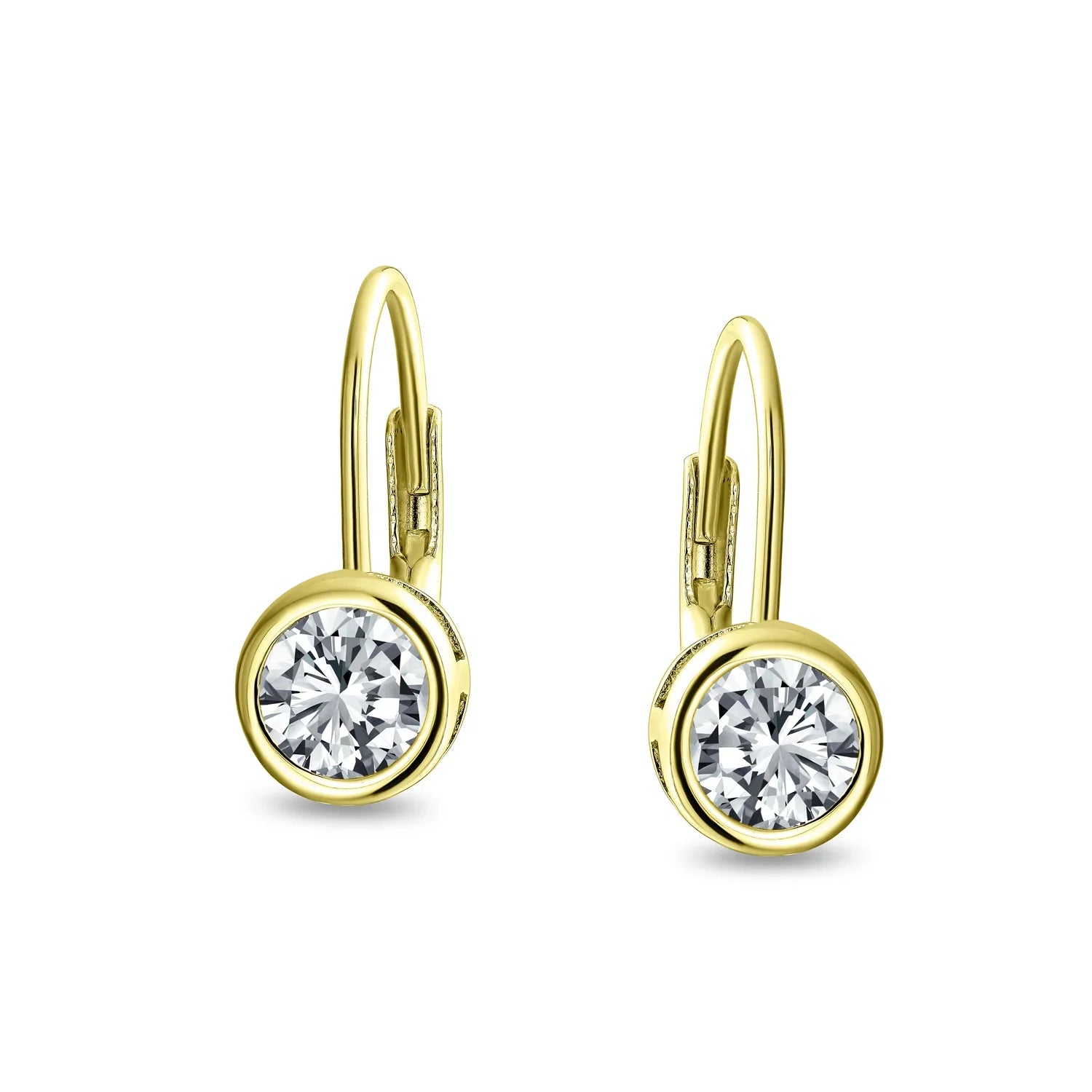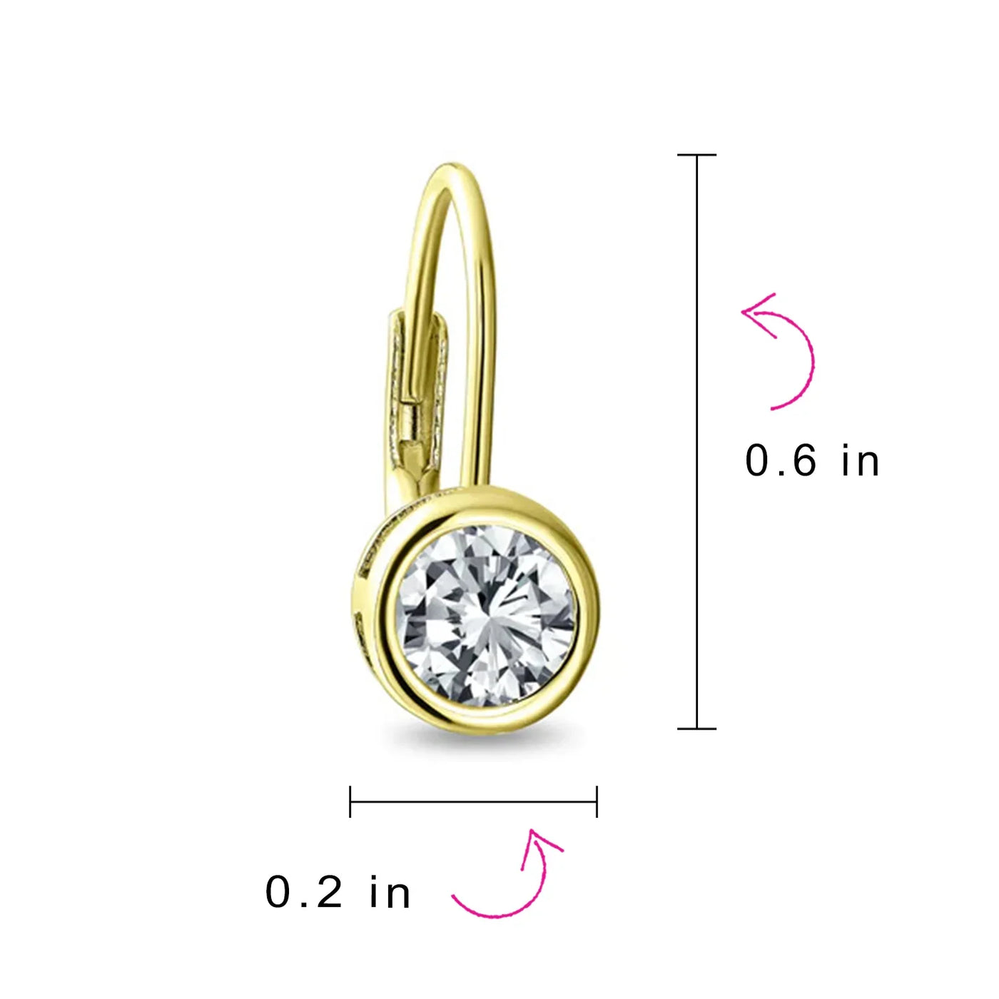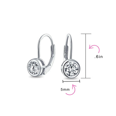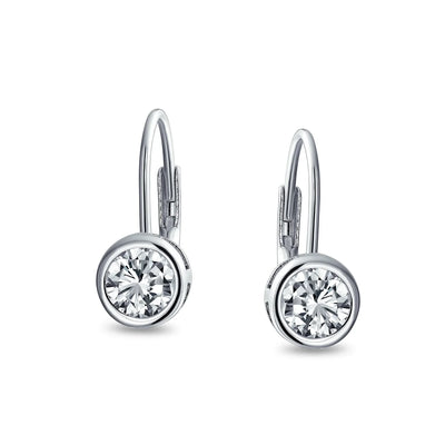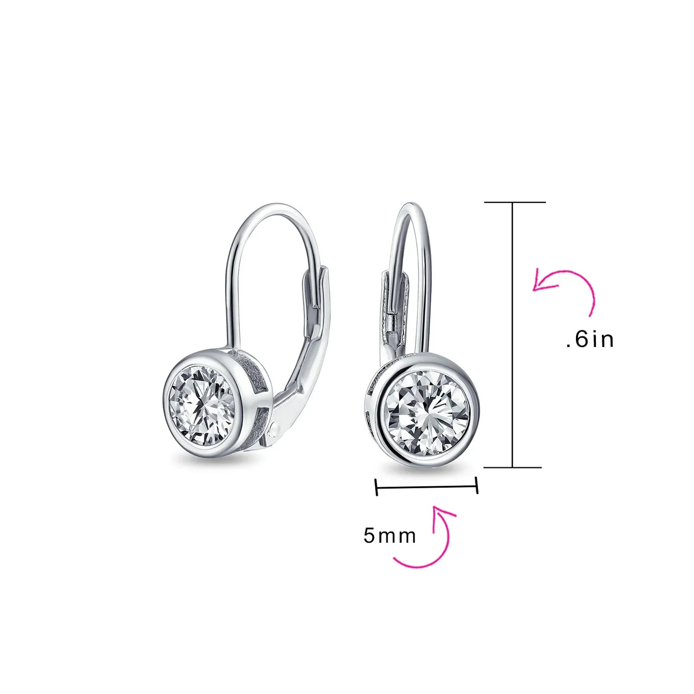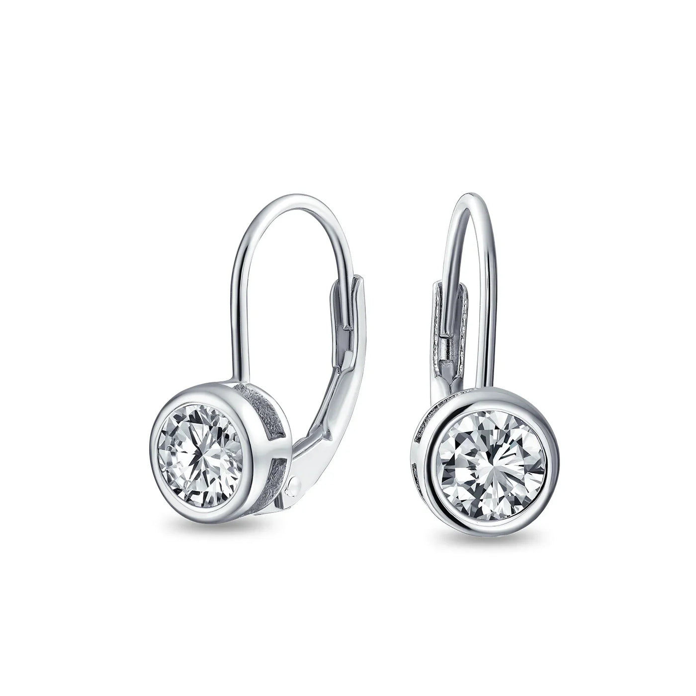 - A perfect choice for ladies who love to sparkle, our bezel lever back CZ drop earrings are a sensational accessory. Featuring a 5mm round clear cubic zirconia stone, these sterling silver earrings will make her shine. Affordable and stylish, these sterling silver round cut CZ lever back earrings are a must-have for fashionable women. Rhodium plated to resist tarnish, they maintain their shine for years. Add contemporary style to any outfit with these stunning cubic zirconia round earrings.