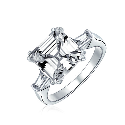 - Show your love for your fiancé with this elegant 3-stone engagement ring, featuring a stunning 4.5 CT Asscher cut CZ center stone, flanked by two brilliant baguette CZs on a beautiful .925 sterling silver band.
