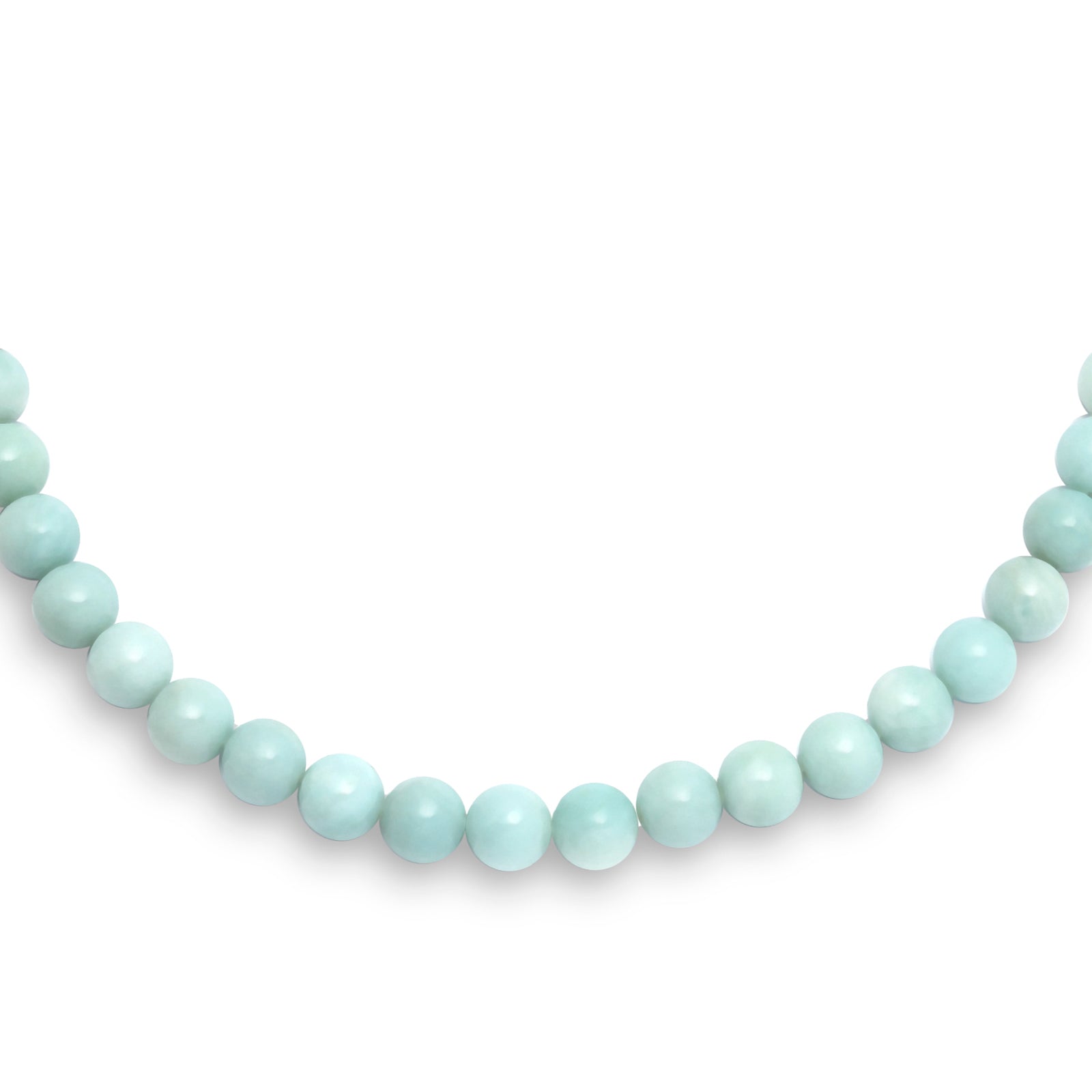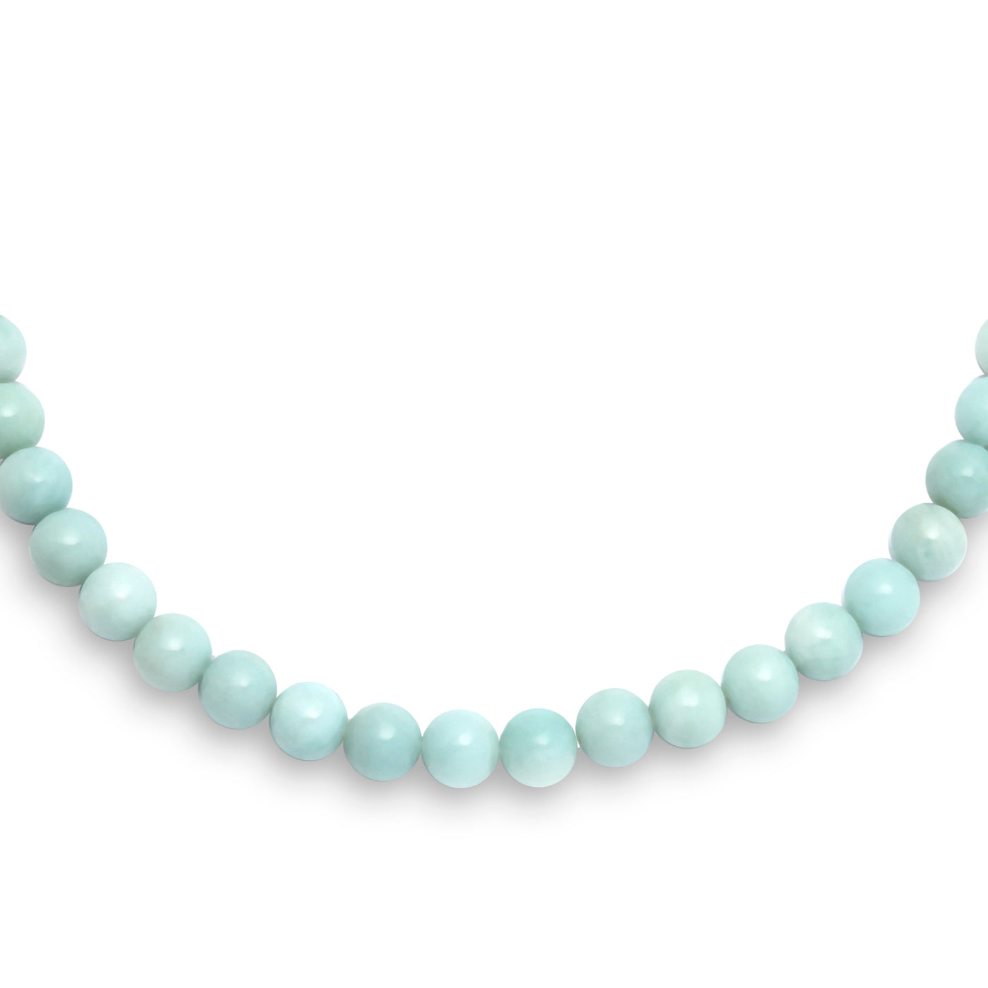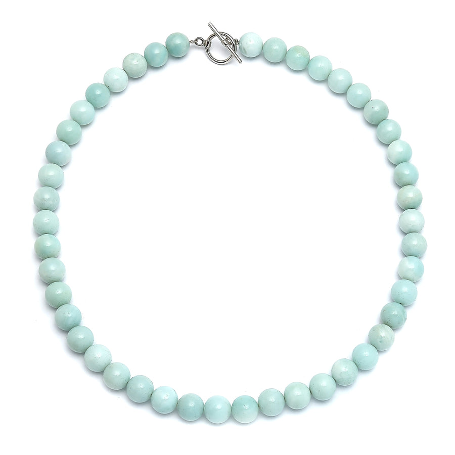 - Elevate your style with our stunning blue Amazonite necklace. This nature-inspired gem jewelry features 10mm beads with subtle tonal variations. The bluish-green color of our Amazonite necklace is captivating. Amazonite is believed to promote inner strength, kindness, and practicality. Known as a lucky hope stone, it’s perfect for any occasion. Made with smooth, round 10mm beads, it hangs at 18 inches. The silver-plated toggle clasp ensures easy wear. Ideal for beach days or backyard barbecues. Order yours today!