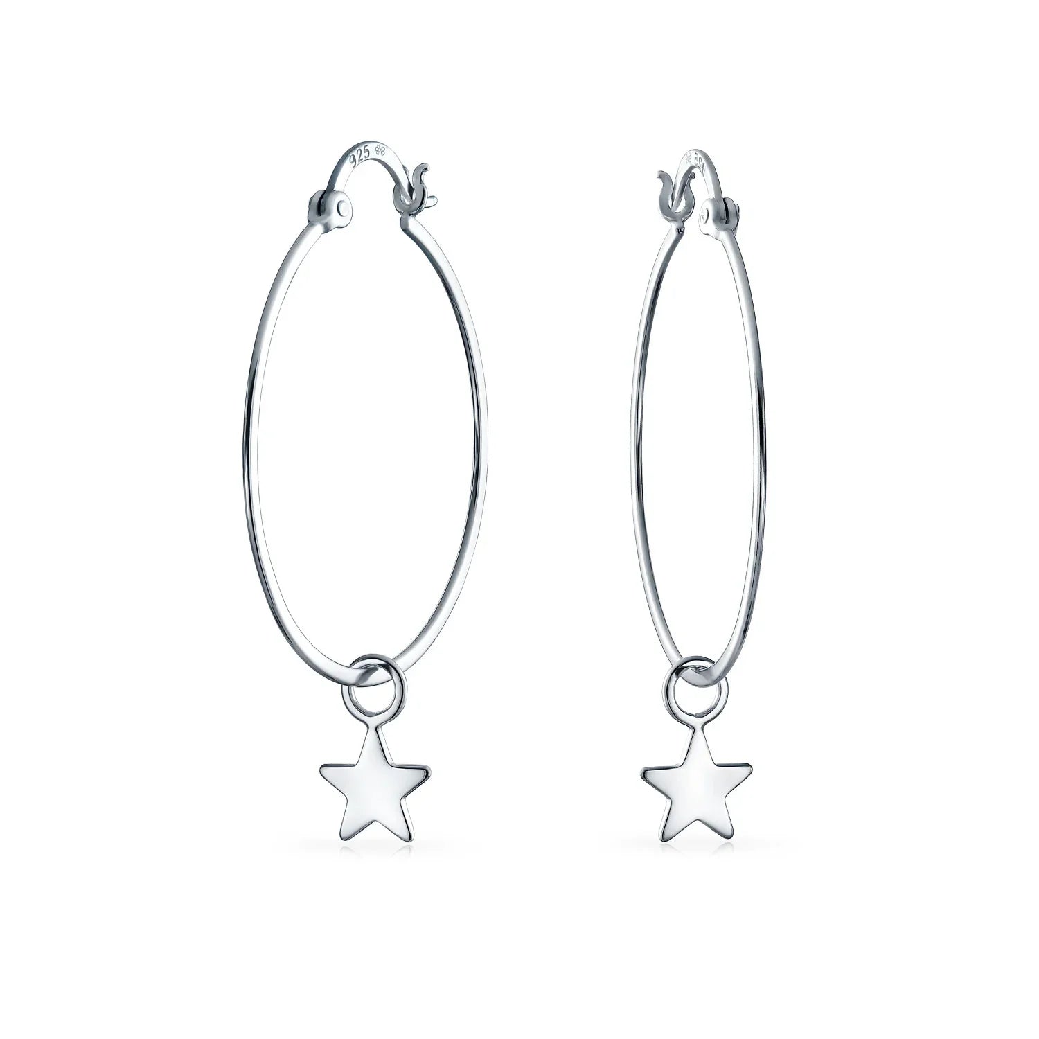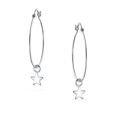 - For a celestial twist on classic hoops, these radiant dangle hoop earrings feature a high-polished star charm. Elevate your style!