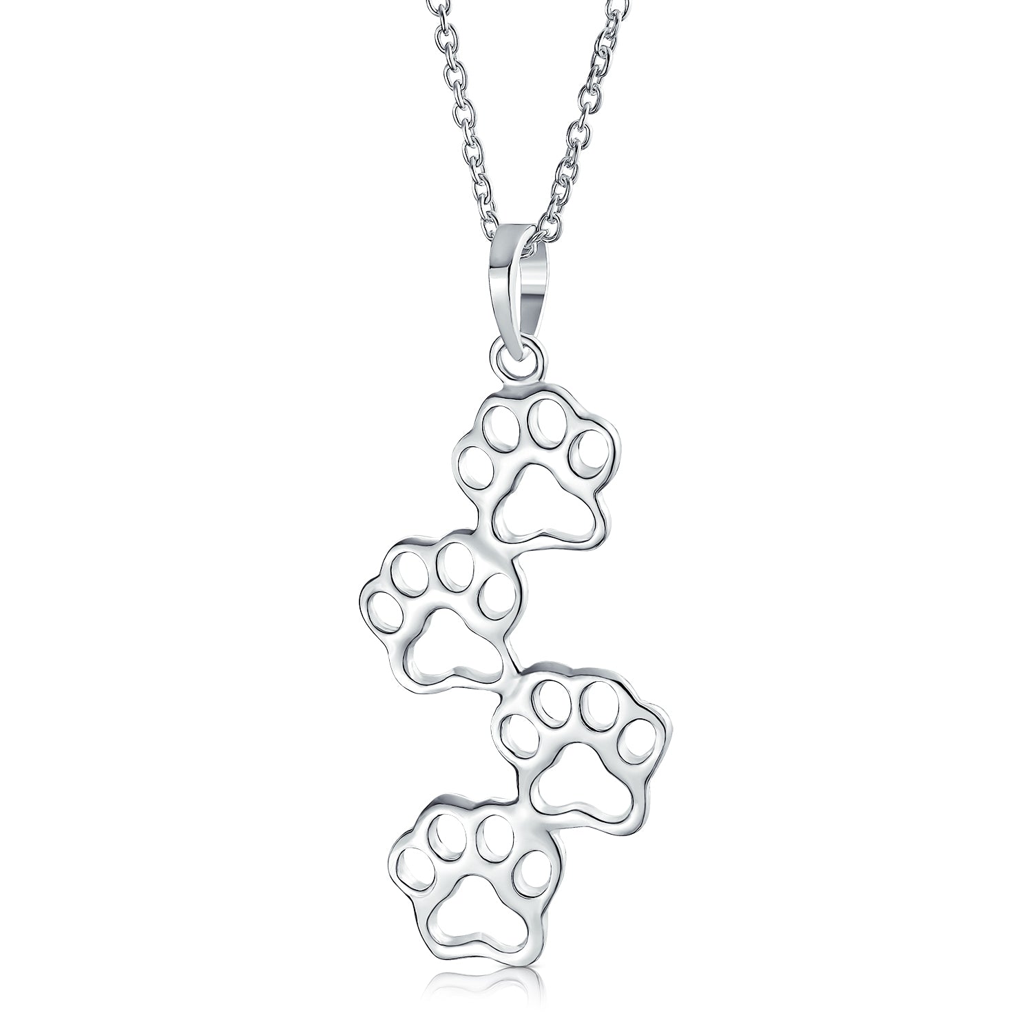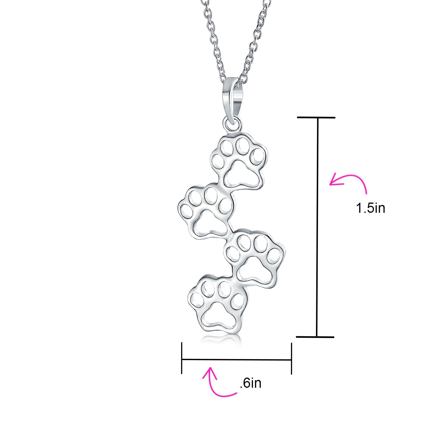 - Introducing our new .925 Sterling Silver dog paw pendant necklace, a must-have for any jewelry collection. This adorable piece features four delicate paw prints on an 18-inch rolo chain, creating a stylish and fun design. Crafted from .925 Sterling Silver, the pendant measures 1.50 inches in length and .60 inches in width. The necklace secures with a spring ring clasp for a secure fit. Weighing just 3.8 grams, this lightweight necklace is comfortable for all-day wear. Layer this paw print necklace with other .925 Sterling Silver animal necklaces for a trendy look. Elevate your style with this charming and unique piece.