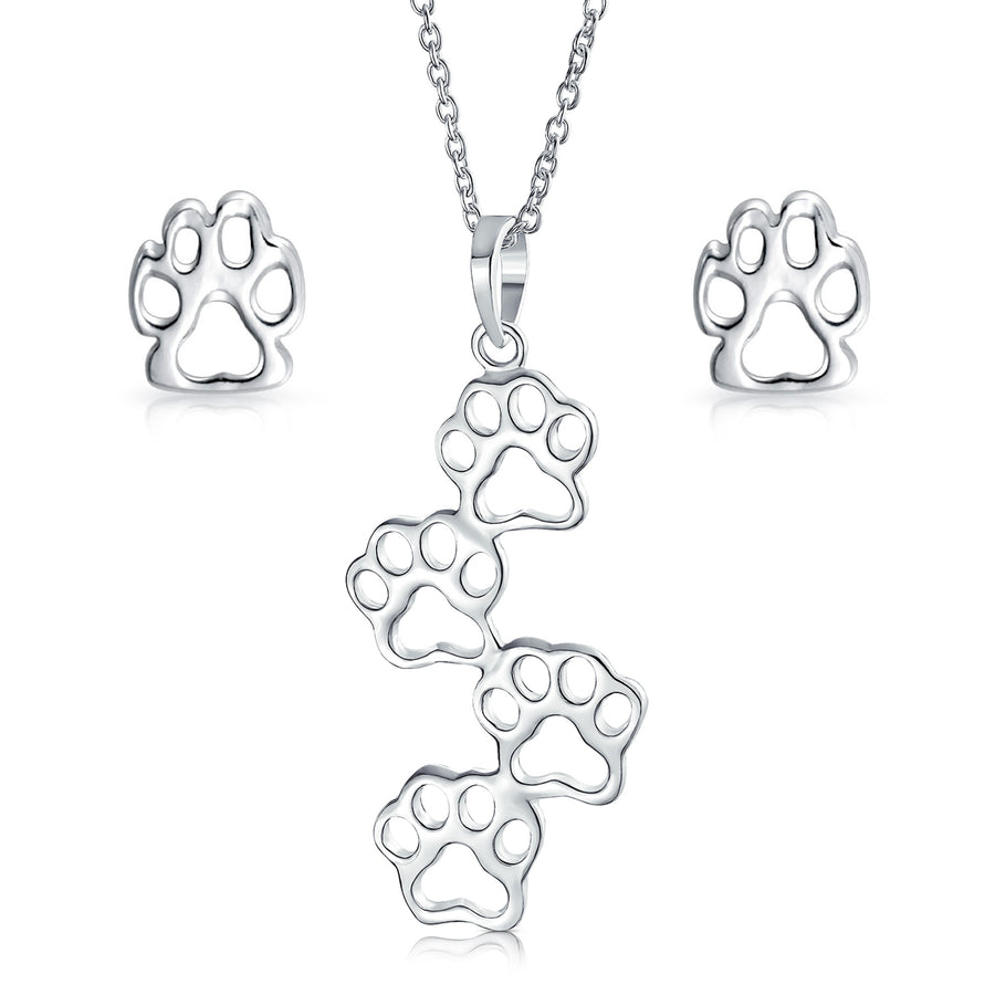 - Show off your love for furry friends with this adorable cut-out style pendant and stud earring jewelry set featuring a four-legged animal theme and four paw prints. Crafted from polished sterling silver, this pendant is a must-have for dog and cat lovers alike.