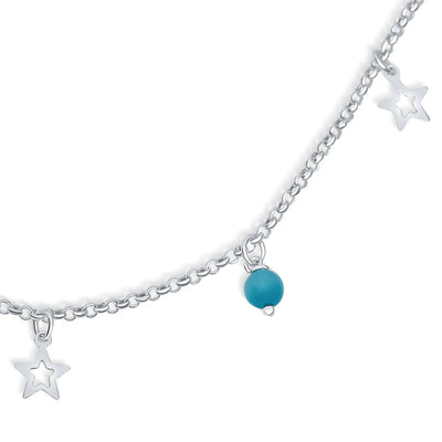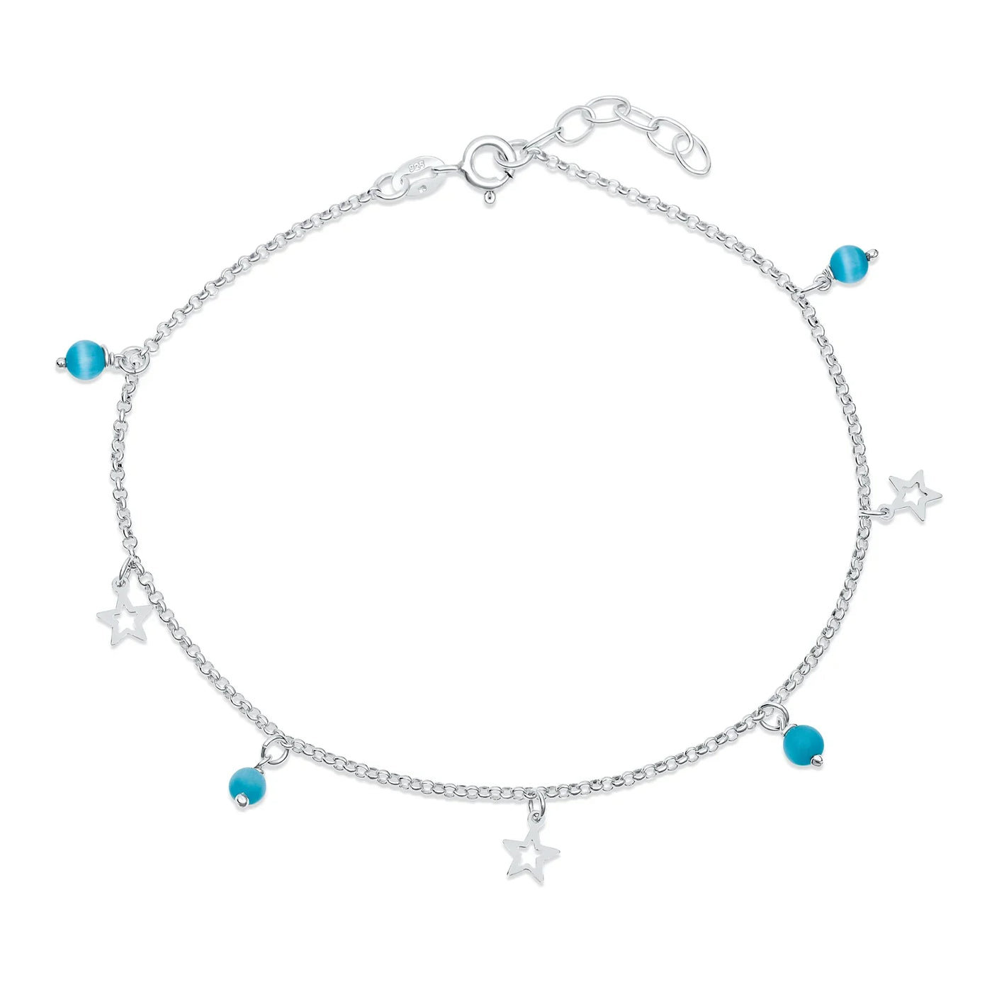 • Shine bright this summer with our star-filled sterling silver anklet. Features a 9-inch rolo chain with dangling stars and blue Simulated Cats Eye crystals. Includes a 1-inch extender and spring ring clasp for a perfect fit. Weighs just 2.5 grams, ideal for all-day wear with sundresses and wedges. Perfect as a birthday gift for the superstars in your life.