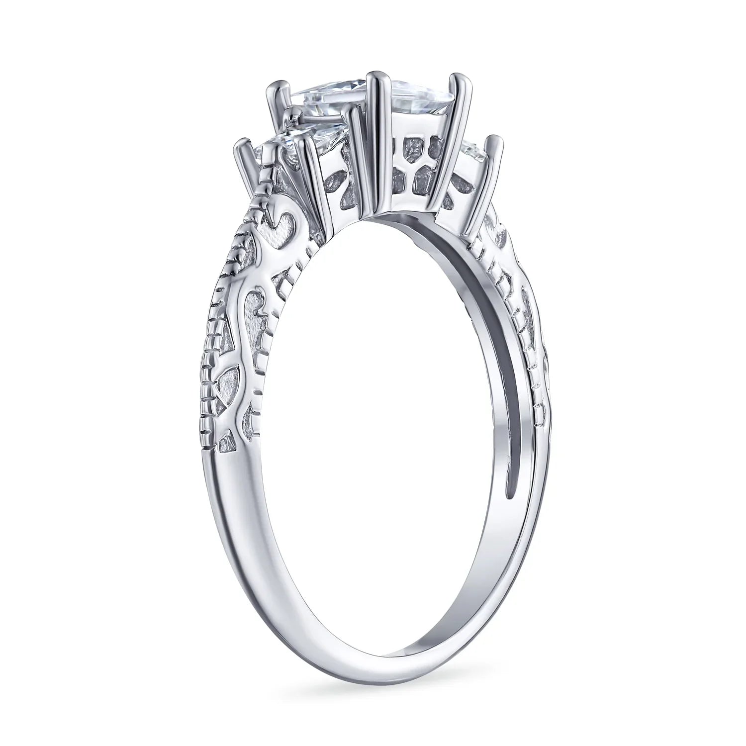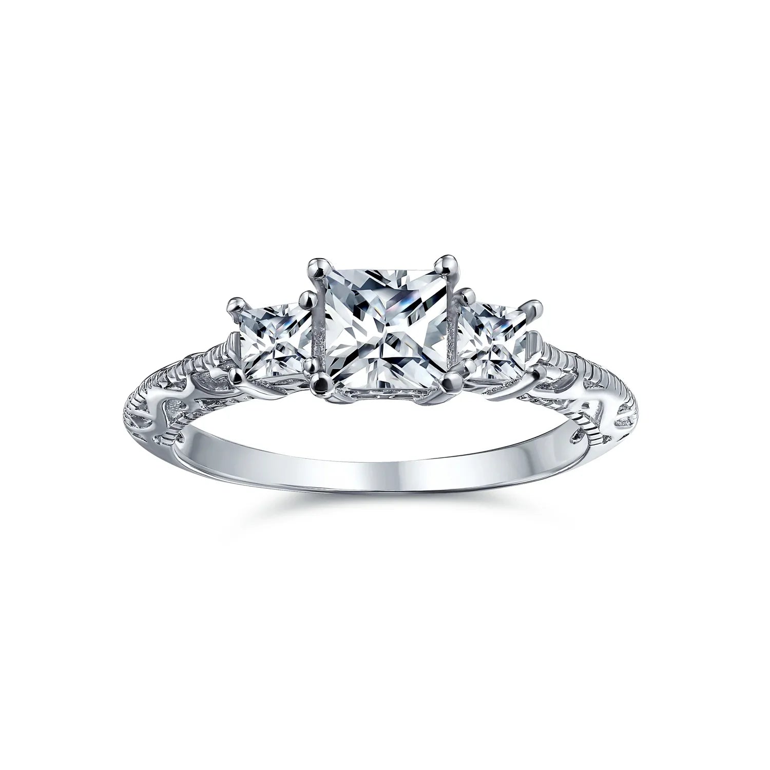 - Propose with our CZ princess cut engagement ring and make her smile. Featuring 3 shimmering princess cut stones, four prong set. The sterling silver band has milgrain detail, adding a feminine touch. Rhodium plating ensures this Art Deco jewelry resists tarnish and stays polished.