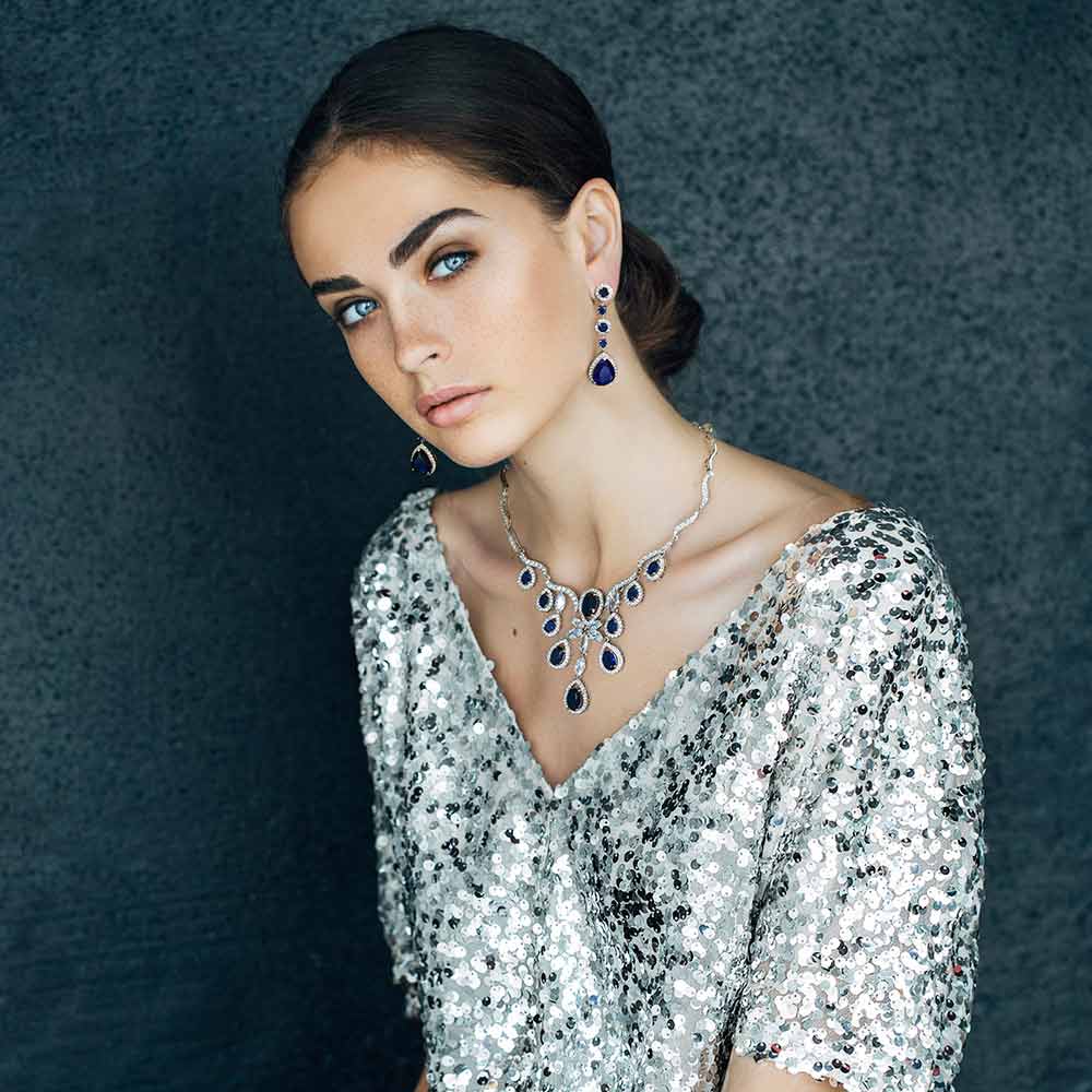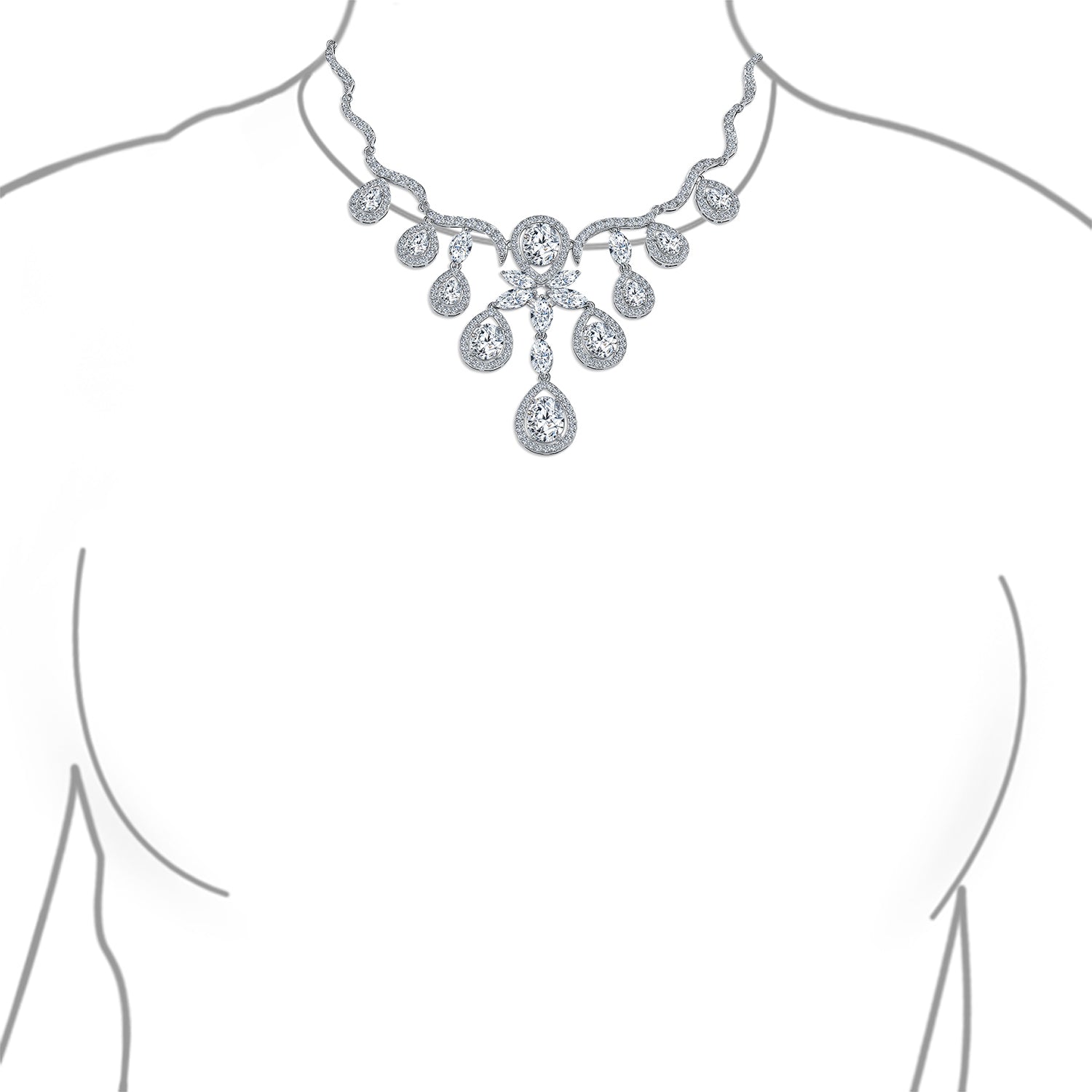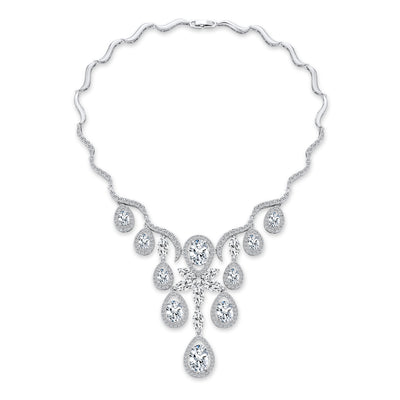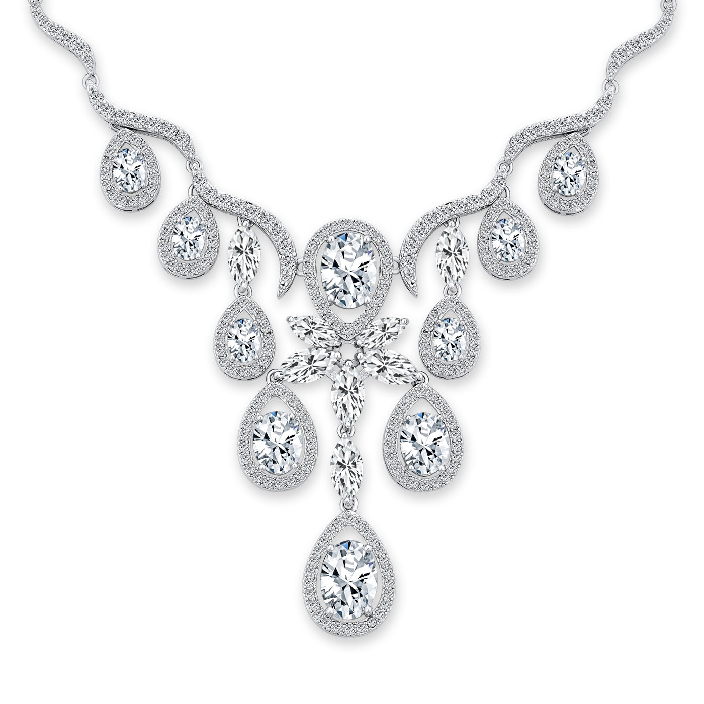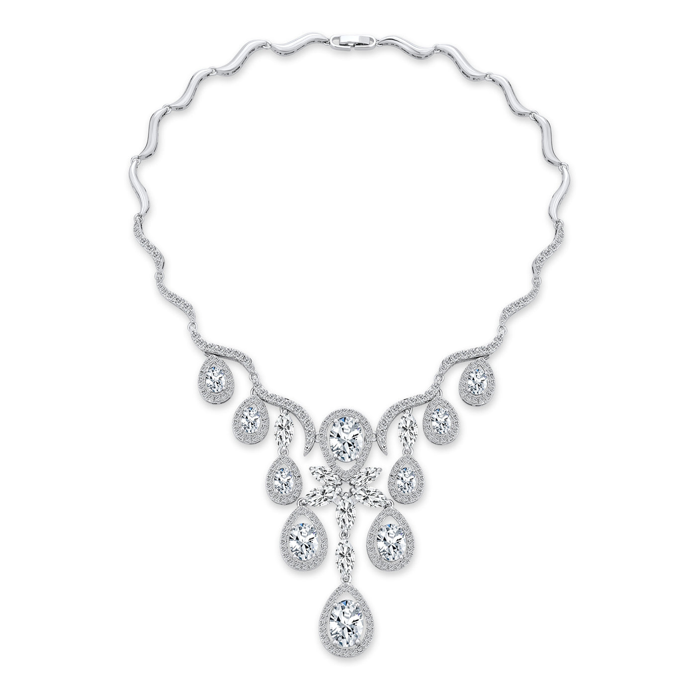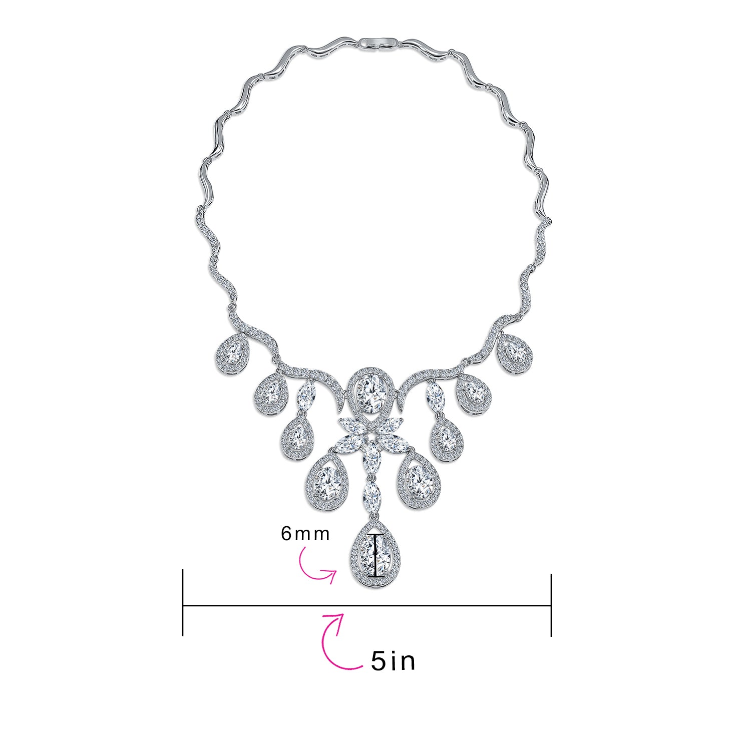 • Make a statement on your special day with our stunning rhodium-plated wedding necklace. Featuring an elegant Victorian design and adorned with simulated sapphire, this 16-inch necklace is the perfect accessory to complete your bridal lookw ith its timeless appeal, youll find yourself reaching for this necklace long after the wedding bells have stopped ringing. The teardrop CZ cascading from a wave-style chain adds a touch of sophistication and glamour that will elevate any outfit for unforgettable moments beyond your big day."