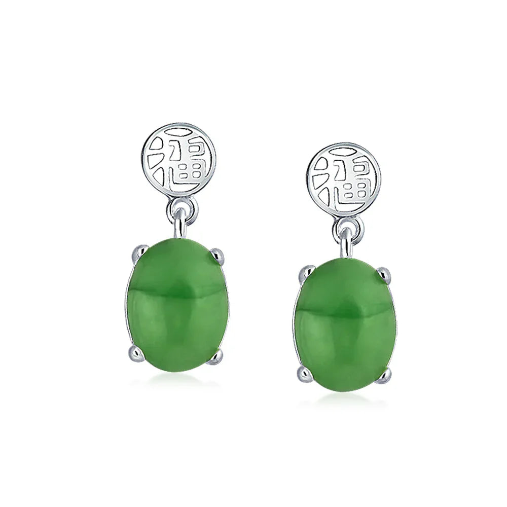 - Experience fortune with our sterling silver dangle earrings featuring dyed green jade. The Chinese symbol for fortune adorns the round post. An elegant oval jade pendant hangs beneath. Perfect good luck jewelry for any occasion. Measures 0.56in x 0.31in, weighs 3.06 grams. Stone size: 10mm x 8mm. Material: .925 Sterling Silver, Dyed Green Jade.